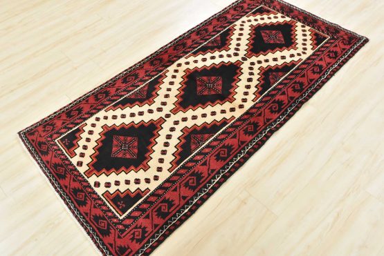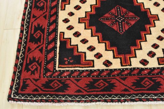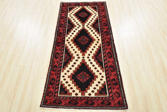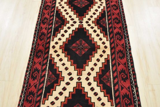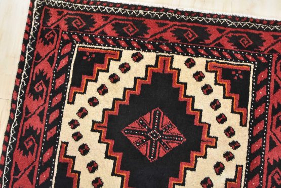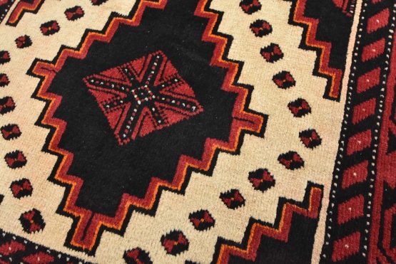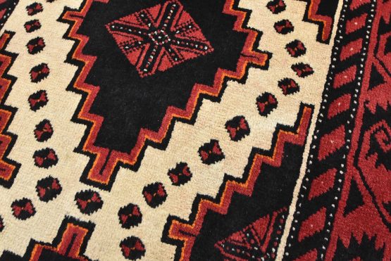 An authentic vintage tribal Baloch rug hand-knotted with fine wool and natural dyes. This nomadic oriental rug features diamond-shaped medallions surrounded by geometric flowers set against an ivory background. The wool pile does show some minimal wear; please refer to the photos. Otherwise, this rug is in very good condition.