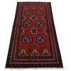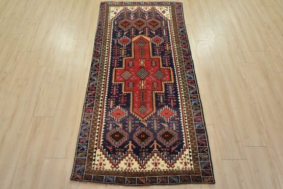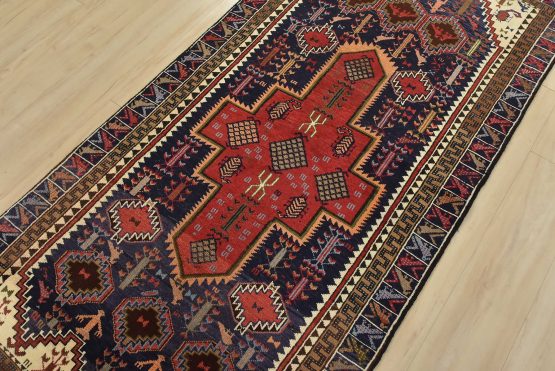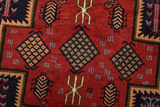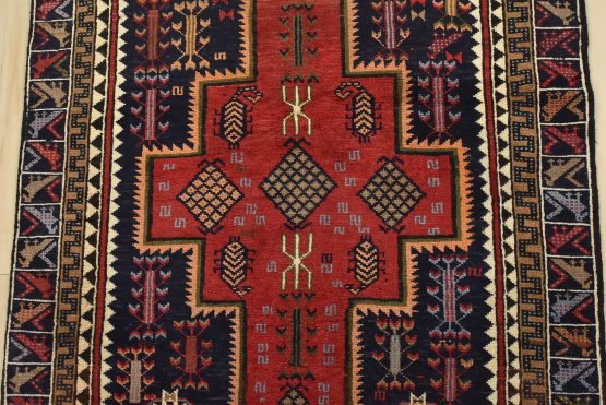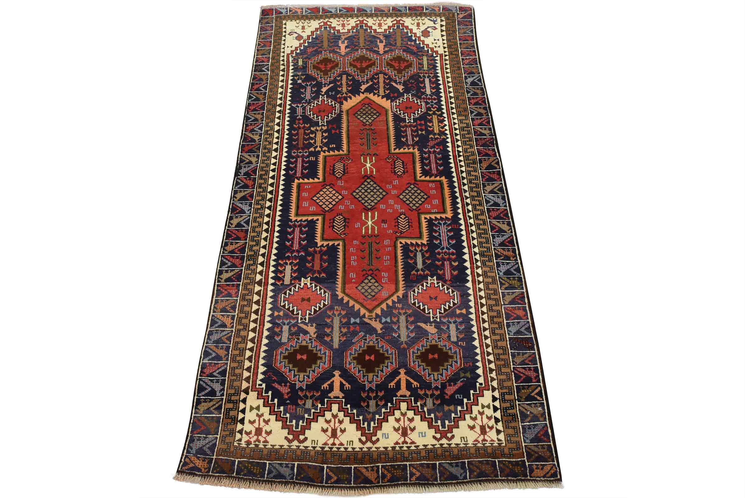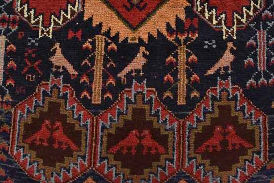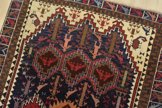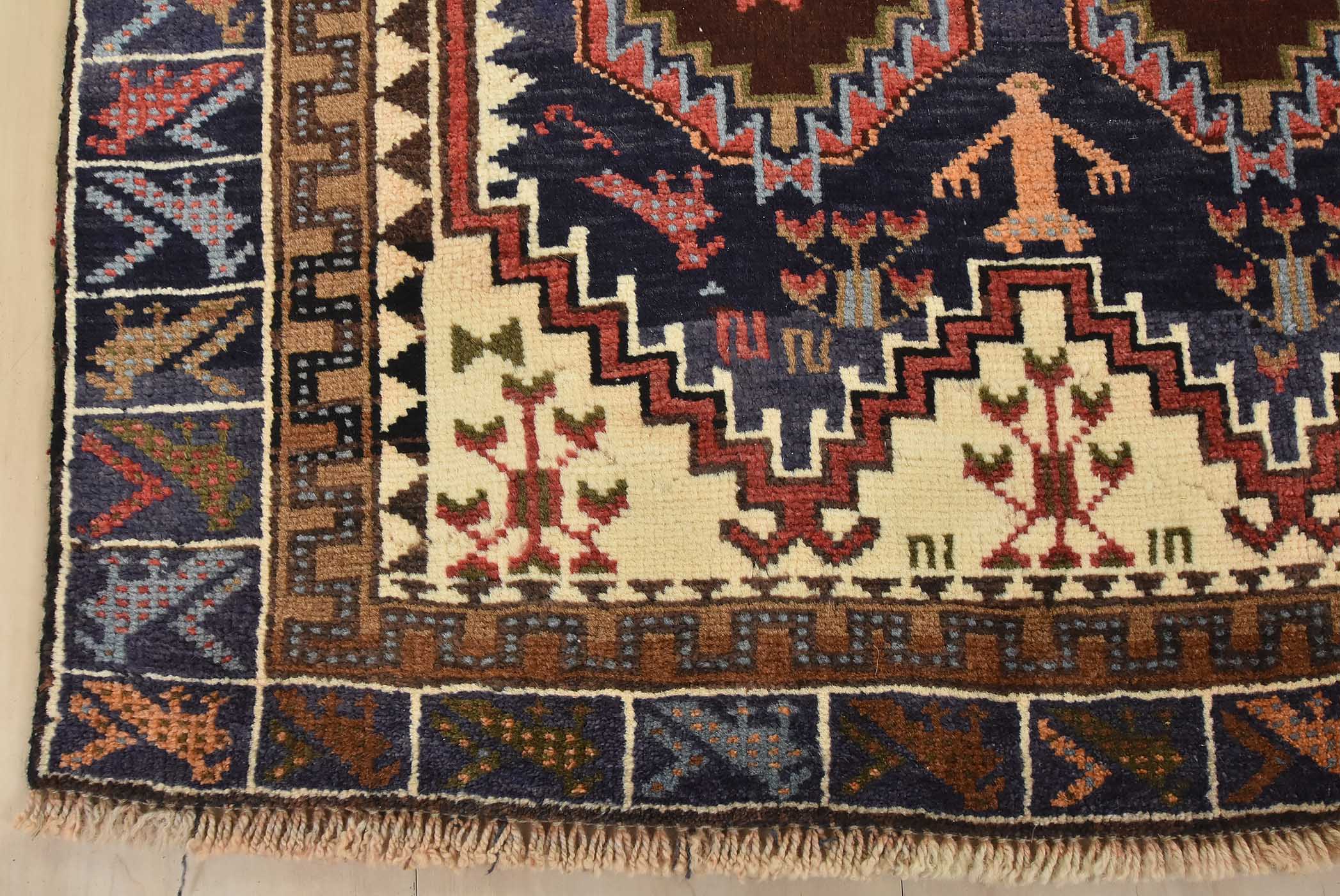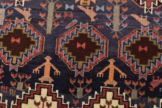 An authentic vintage tribal Baloch rug hand-knotted with fine wool and natural dyes. This nomadic oriental rug features a central medallion surrounded by geometric motifs with bird and human figures set against a blue background. It has a full wool pile with no worn areas and is in very good condition.