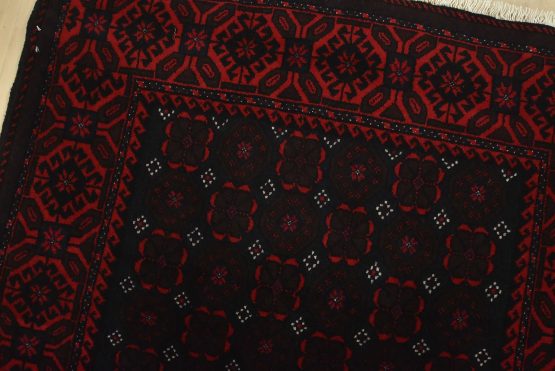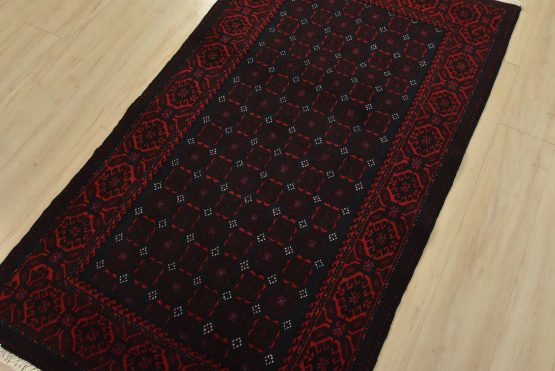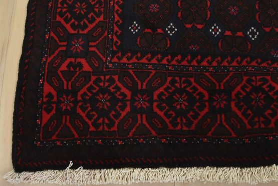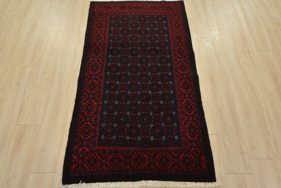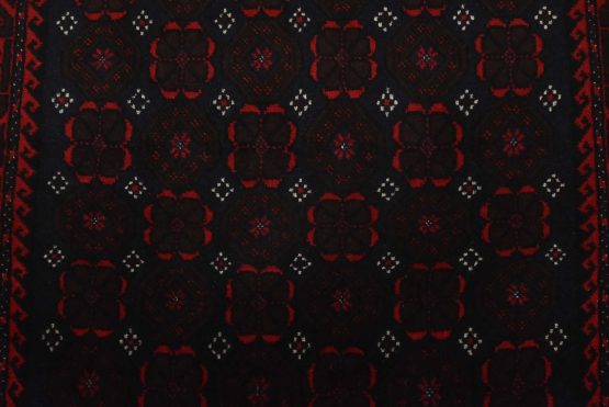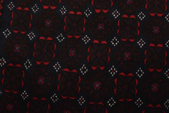 An authentic vintage tribal Baloch rug hand-knotted with fine wool and natural dyes. This nomadic oriental rug features an all-over design with geometric flowers set against a dark blue background. It has a full wool pile with no worn areas and is in very good condition.