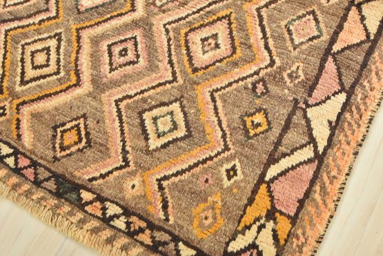An authentic vintage tribal Qashqai rug hand-knotted with fine wool and natural dyes. This nomadic oriental rug features an all-over geometric pattern set against a brown background. It has a full wool pile with no worn areas and is in very good condition.