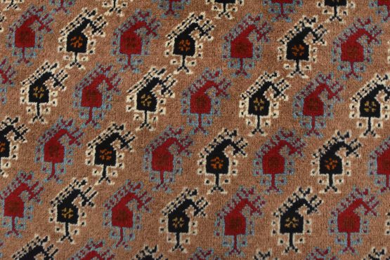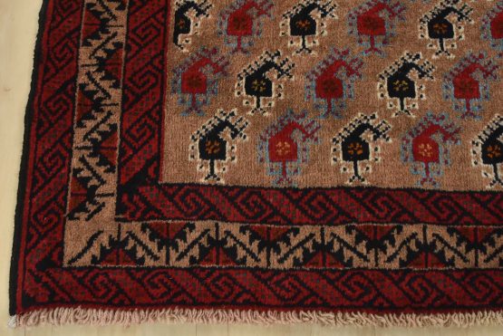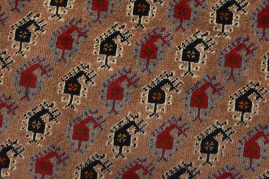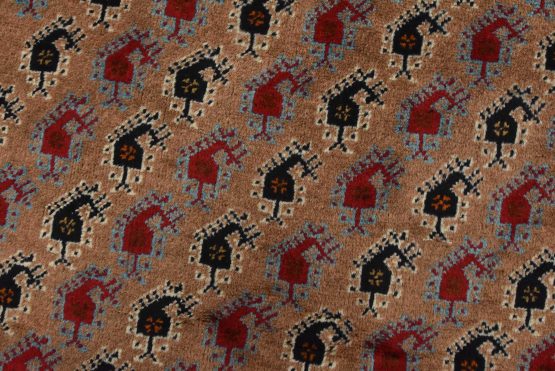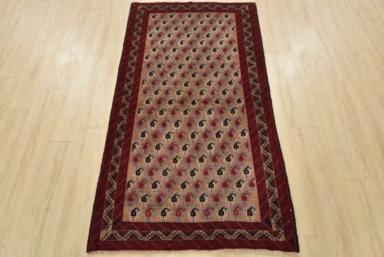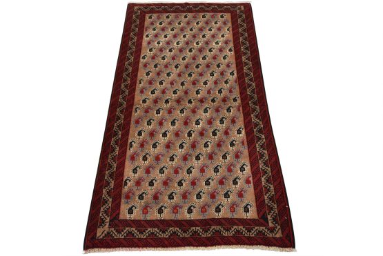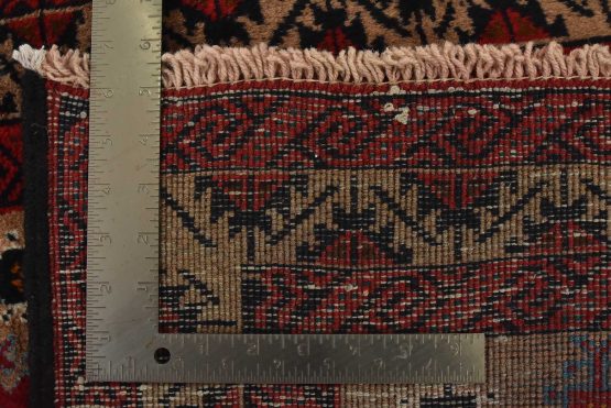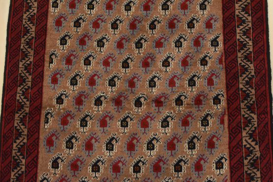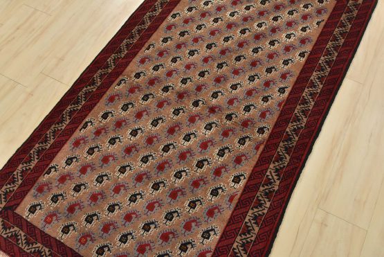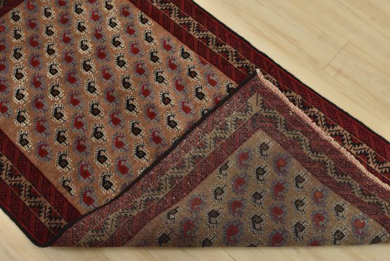 An authentic vintage tribal Baloch rug hand-knotted with fine wool and natural dyes. This nomadic oriental rug features an all-over geometric boteh design set against a brown background. It has a full wool pile with no worn areas and is in very good condition.
