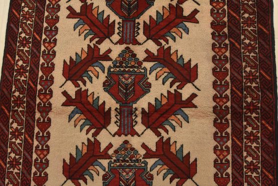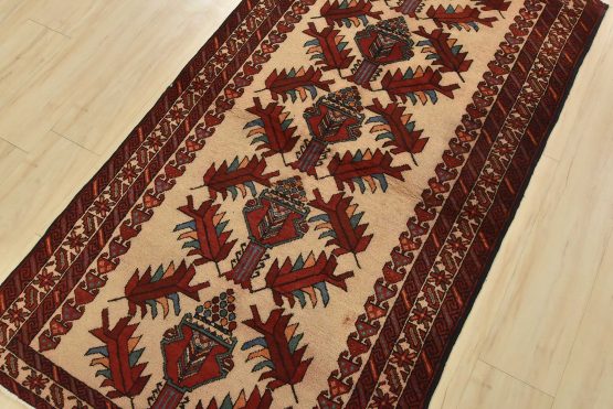 An authentic vintage tribal Baloch rug hand-knotted with fine wool and natural dyes. This nomadic oriental rug features a row of geometric medallions surrounded by geometric botanical motifs set against a beige background. The wool pile shows some minor wear; please refer to the photos. Otherwise, the rug is in very good condition.