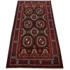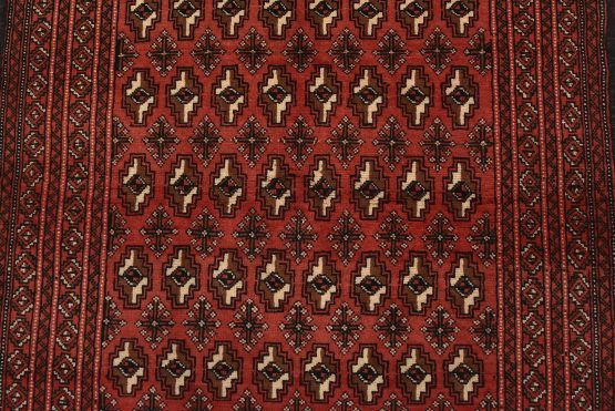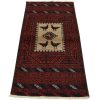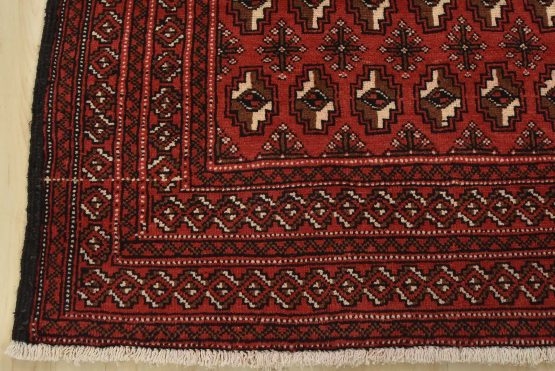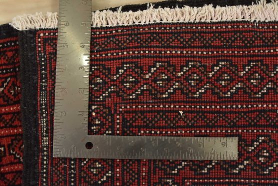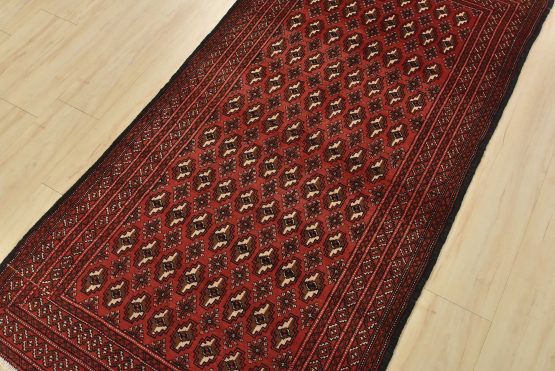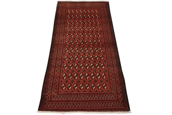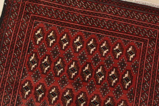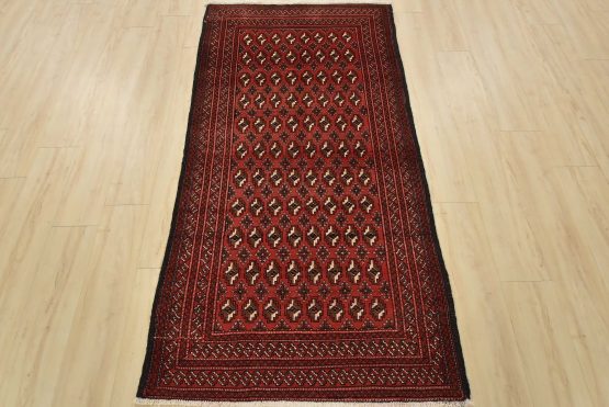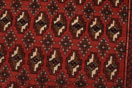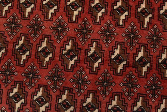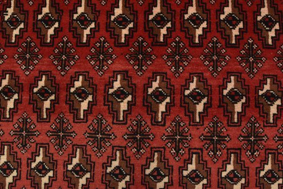 An authentic vintage tribal Baloch rug hand-knotted with fine wool and natural dyes. This nomadic oriental rug features repeating rows of geometric shapes set against a red background. It has a full wool pile with no worn areas and is in very good condition.