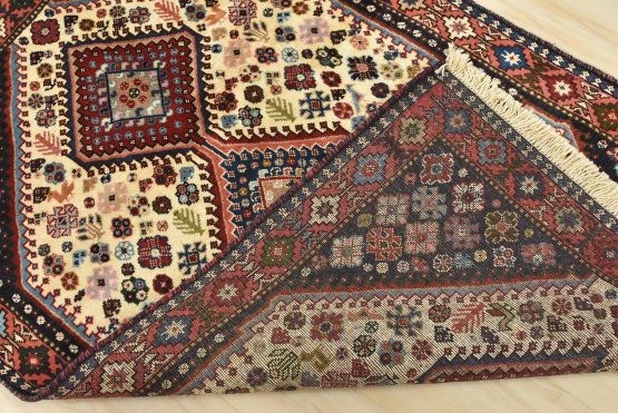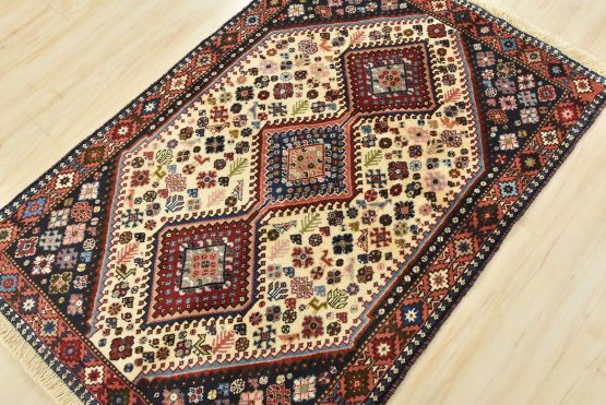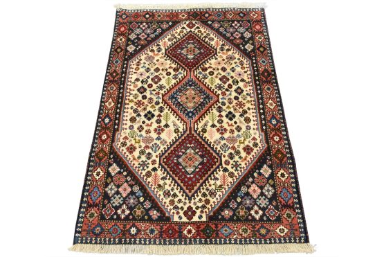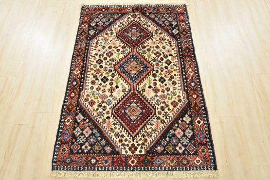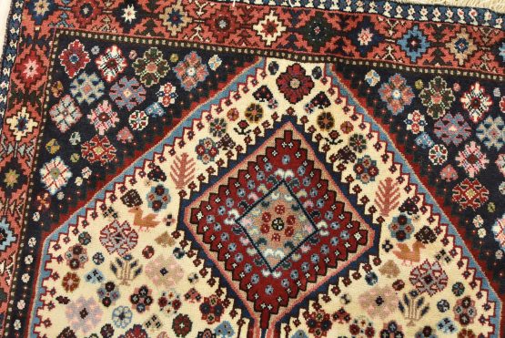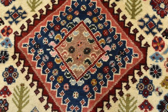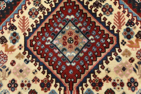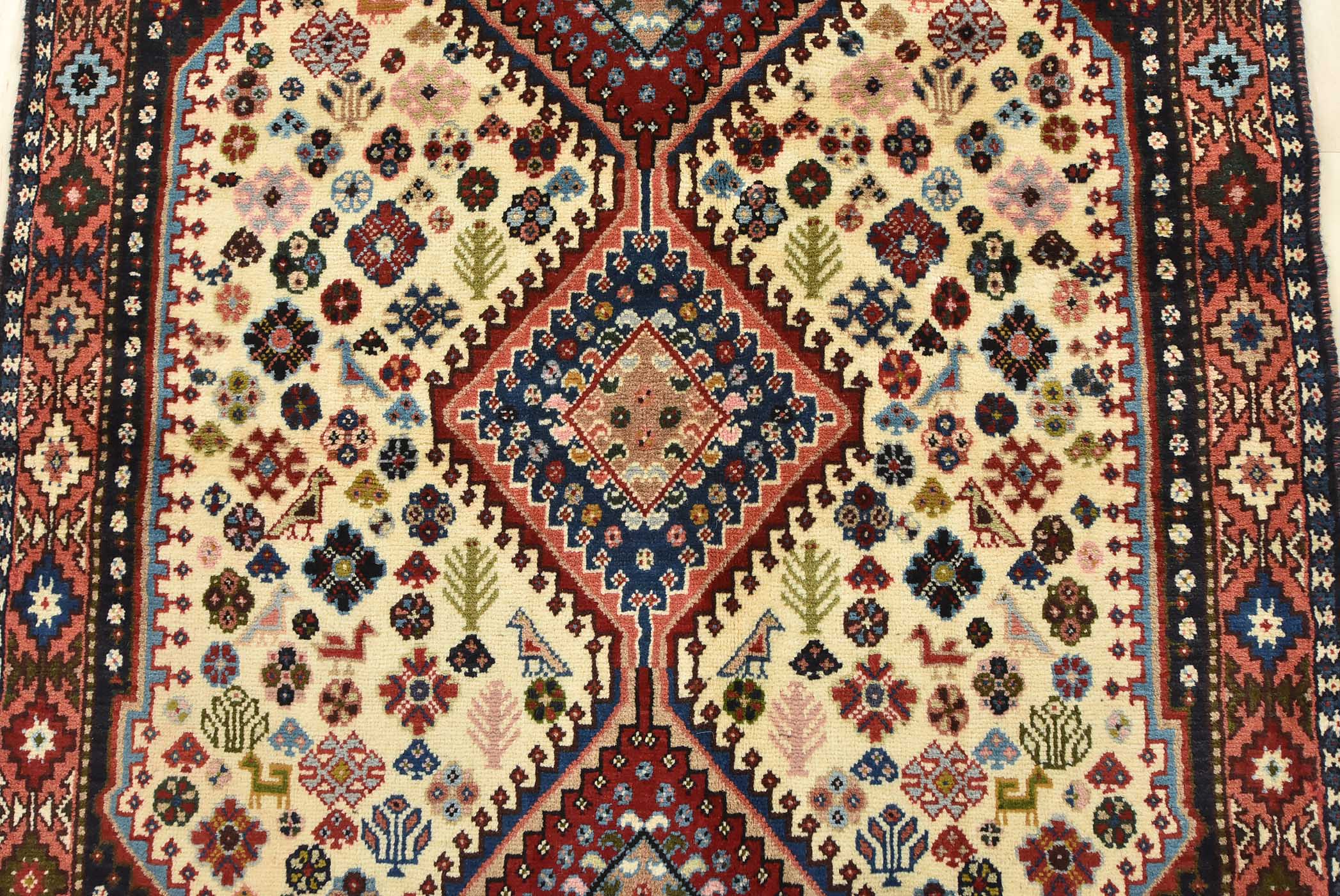 An authentic vintage tribal Yalameh rug hand-knotted with fine wool and natural dyes. This finely woven nomadic rug features geometric medallions surrounded by geometric motifs with bird and animal figures set against an ivory background. It has a full wool pile with no worn areas and is in very good condition.