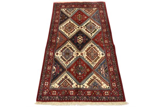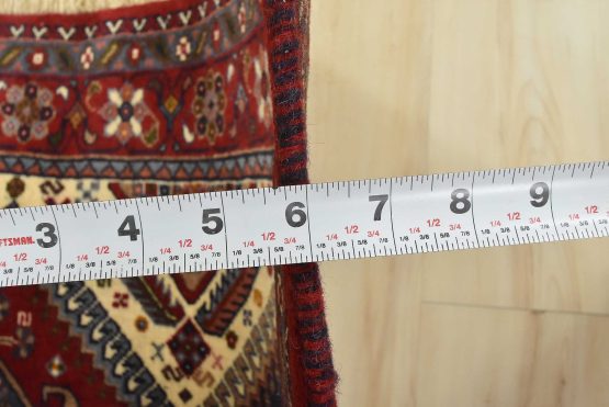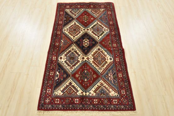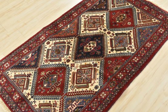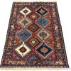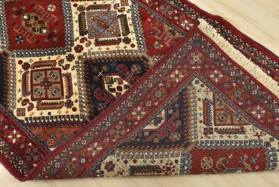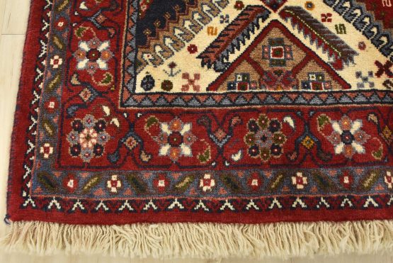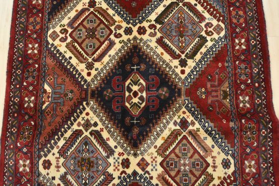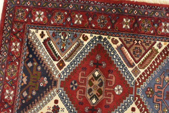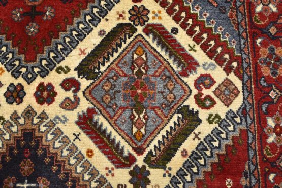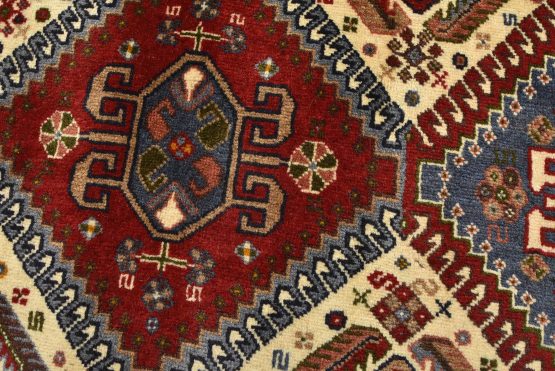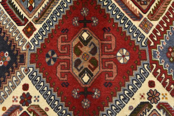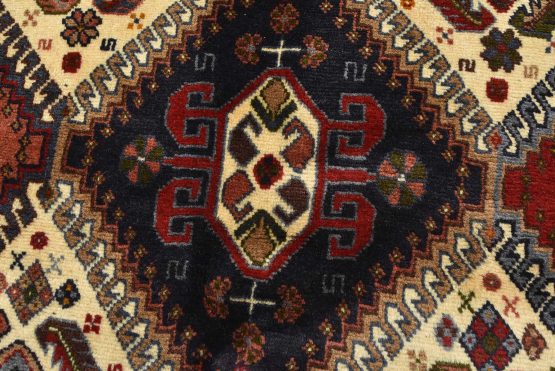 An authentic vintage tribal Yalameh rug hand-knotted with fine wool and natural dyes. This finely woven nomadic rug features an all-over pattern of geometric motifs. It has a full wool pile with no worn areas and is in very good condition.