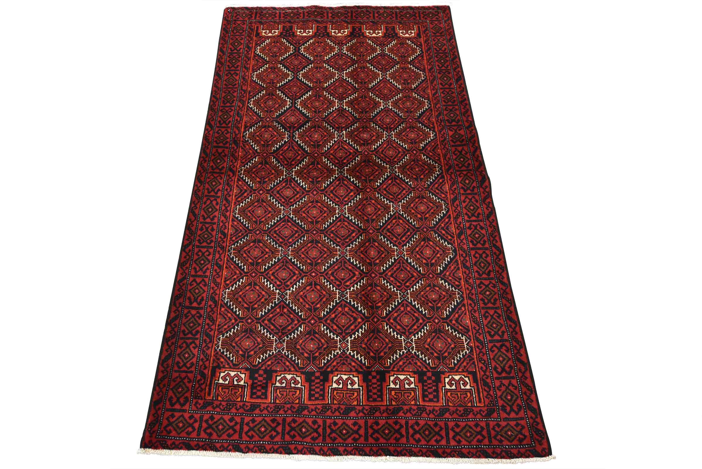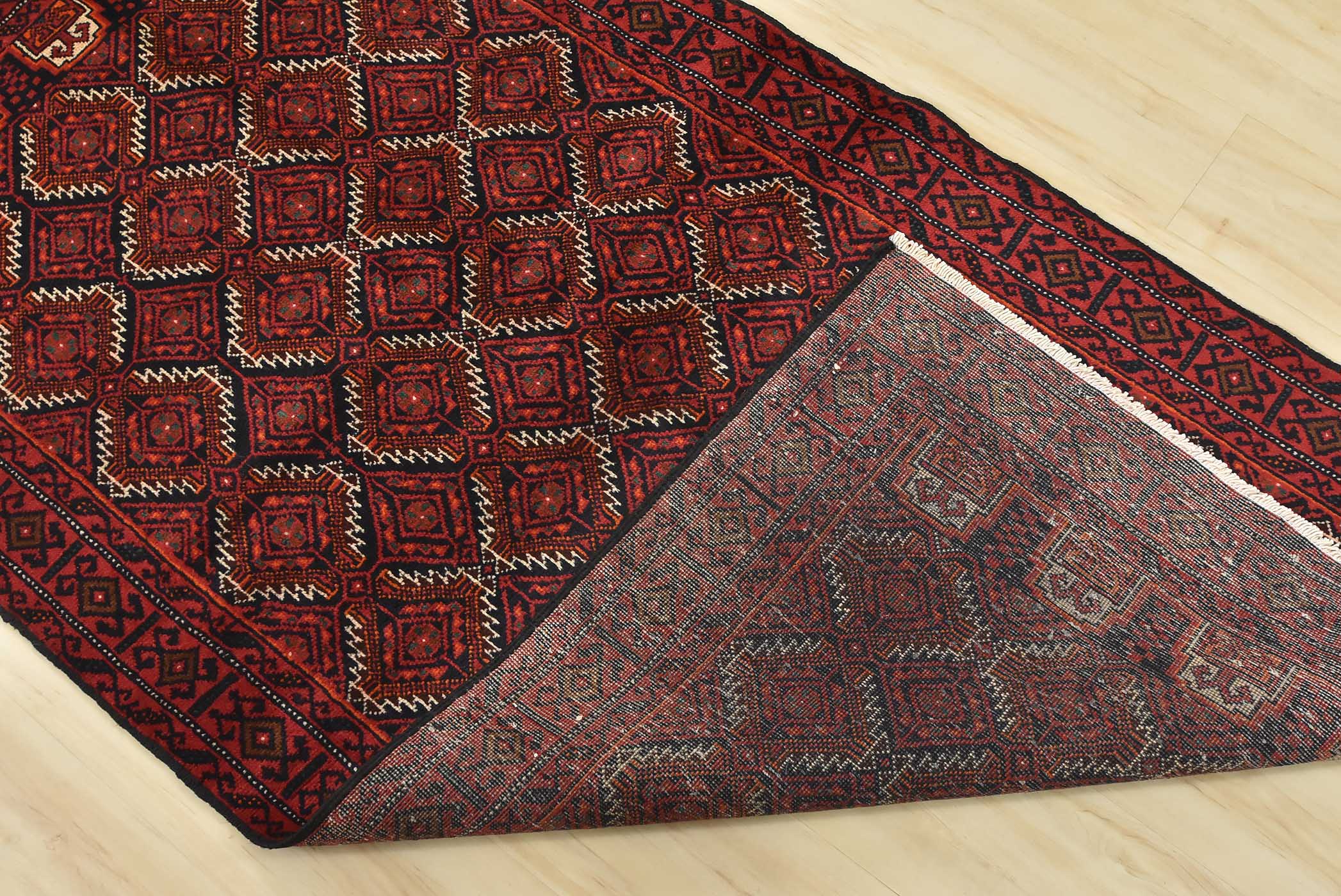 An authentic vintage tribal Baloch rug hand-knotted with fine wool and natural dyes. This nomadic oriental rug features an all-over geometric pattern set against a dark blue background. It has a full wool pile with no worn areas and is in very good condition.