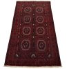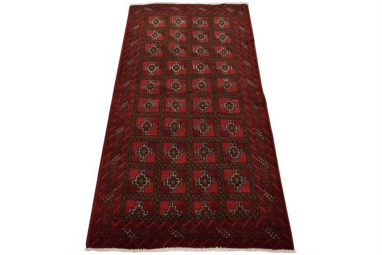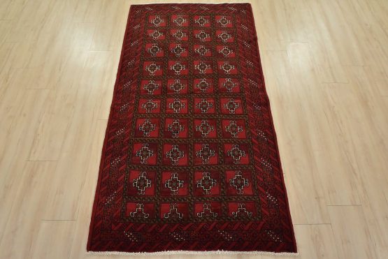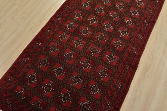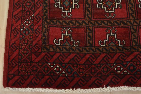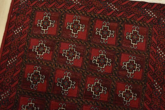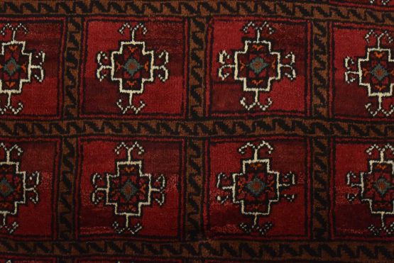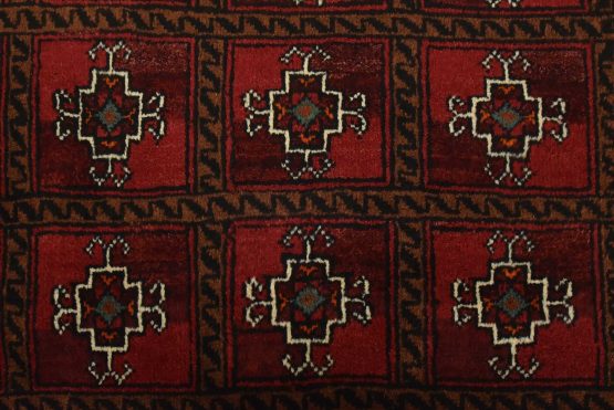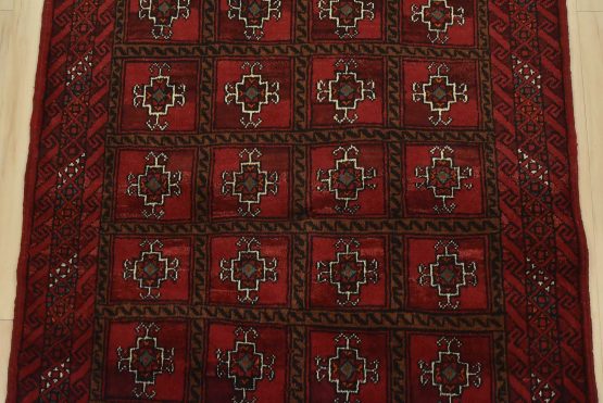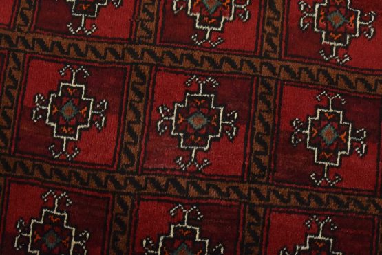 An authentic vintage tribal Baloch rug hand-knotted with fine wool and natural dyes. This nomadic oriental rug features rows of repeating geometric motifs set against a red background. It has a full wool pile with no worn areas and is in very good condition.