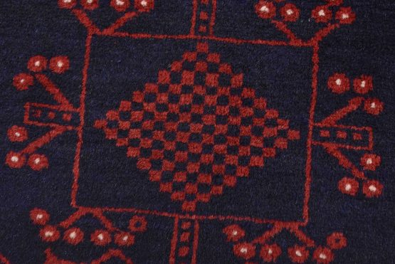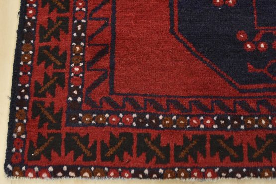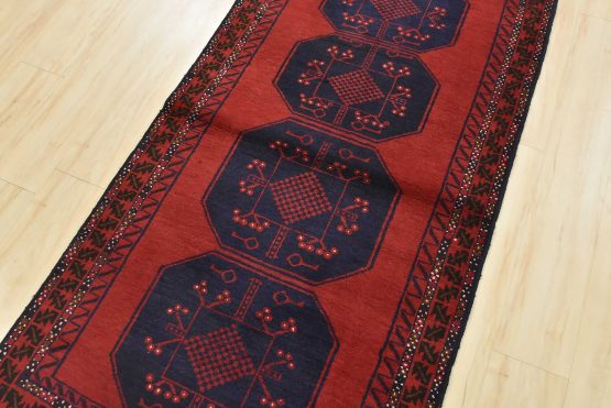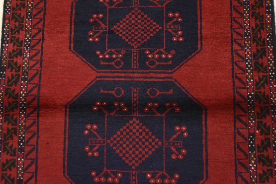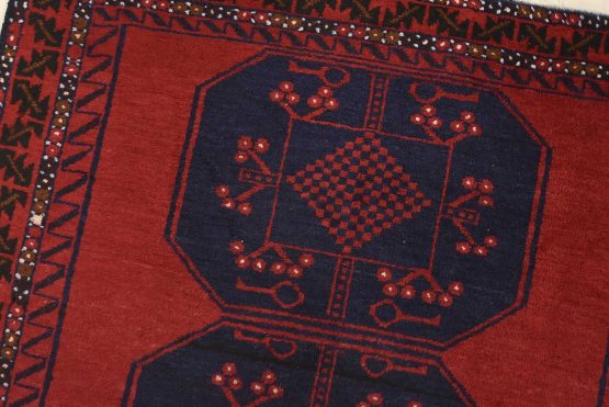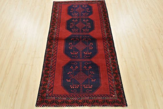 An authentic vintage tribal Baloch rug hand-knotted with fine wool and natural dyes. This nomadic oriental rug features a row of geometric medallions set against a red background. It has a full wool pile with no worn areas and is in very good condition.