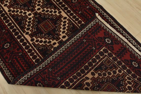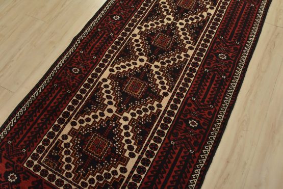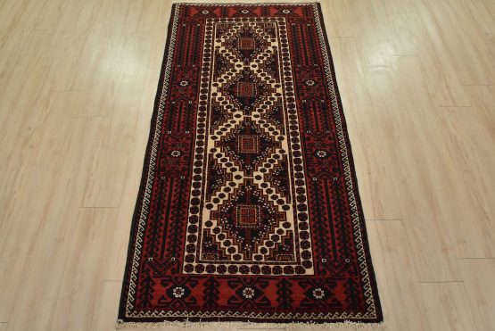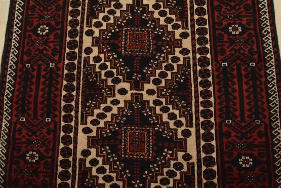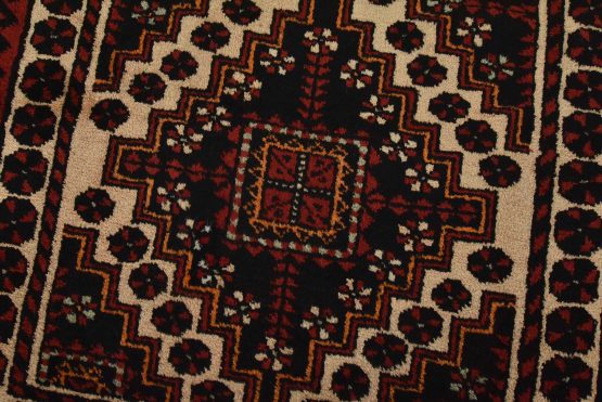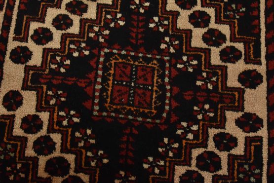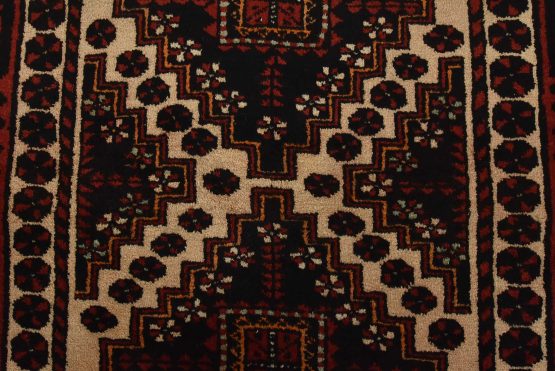 An authentic vintage tribal Baloch rug hand-knotted with fine wool and natural dyes. This nomadic oriental rug features a row of geometric medallions set against a beige background. It has a full wool pile with no worn areas and is in very good condition.