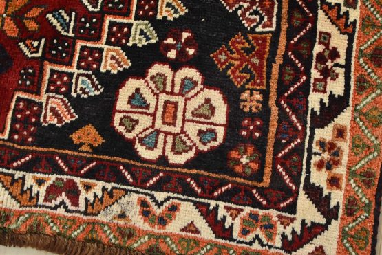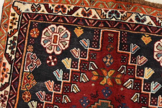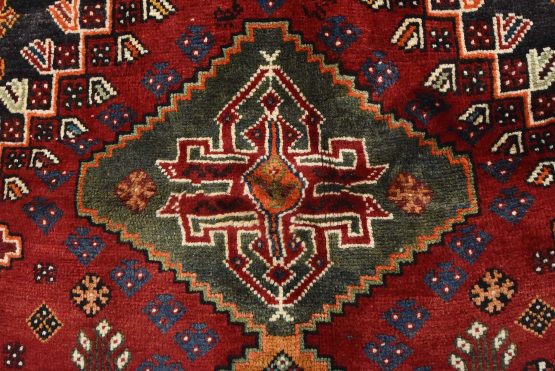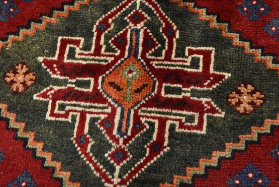 An authentic vintage tribal Qashqai rug hand-knotted with fine wool and natural dyes. This nomadic oriental rug features geometric medallions surrounded by small geometric motifs set against a red background. It has a full wool pile with no worn areas and is in very good condition.