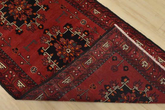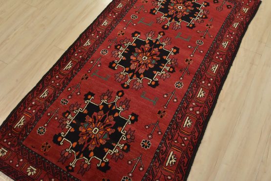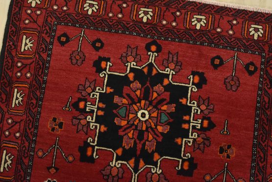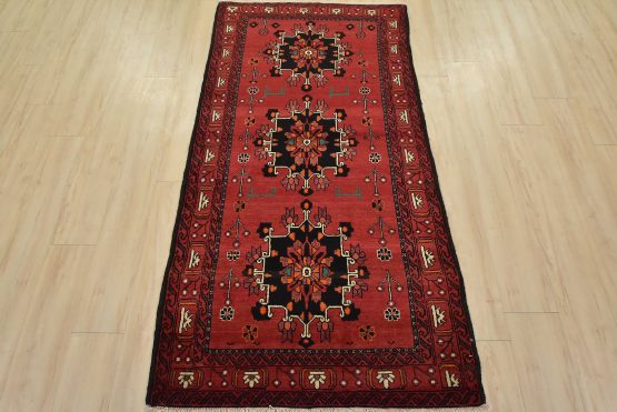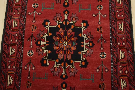 An authentic vintage tribal Baloch rug hand-knotted with fine wool and natural dyes. This nomadic oriental rug features three geometric medallions surrounded by geometric floral and animal figures set against a red background. It has a full wool pile with no worn areas and is in very good condition.
