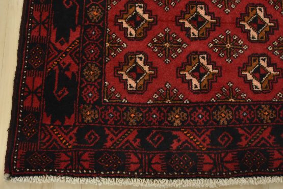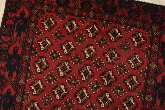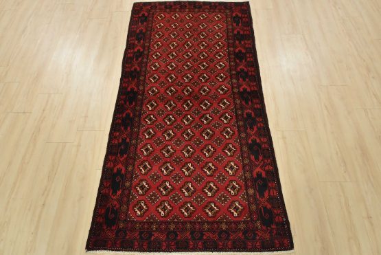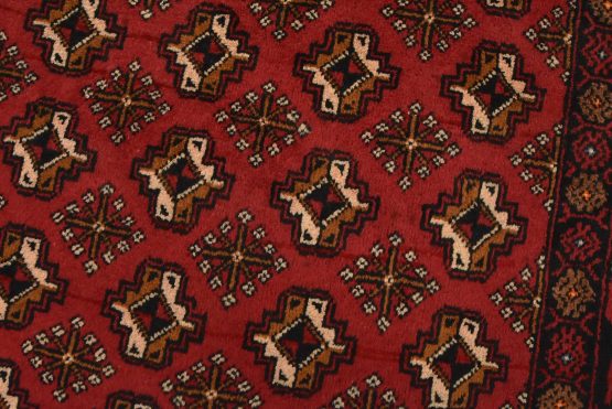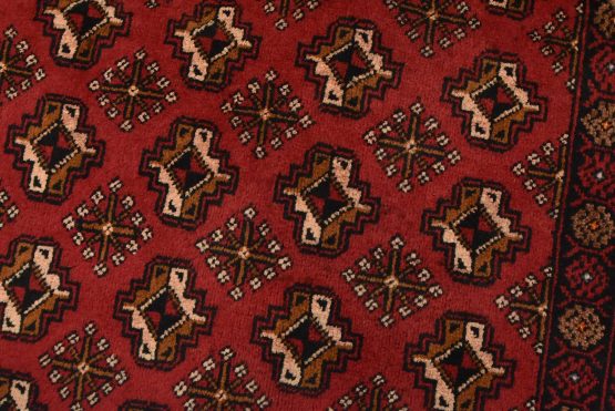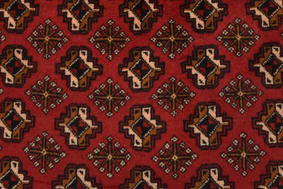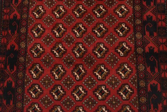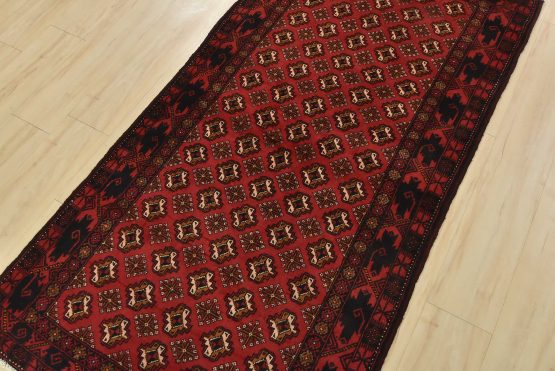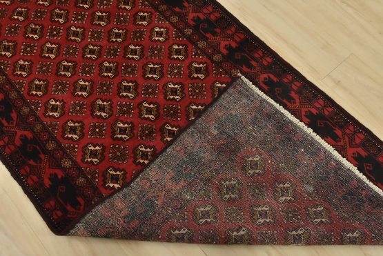 An authentic vintage tribal Baloch rug hand-knotted with fine wool and natural dyes. This nomadic oriental rug features rows of repeating geometric motifs set against a red background. The wool pile shows some minor wear; see photos. Otherwise, this rug is in very good condition.