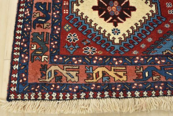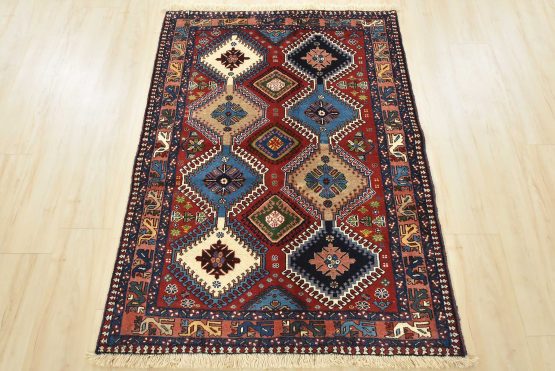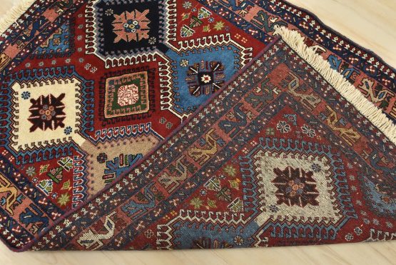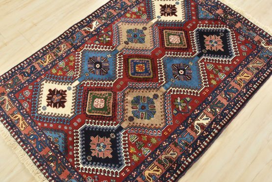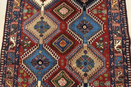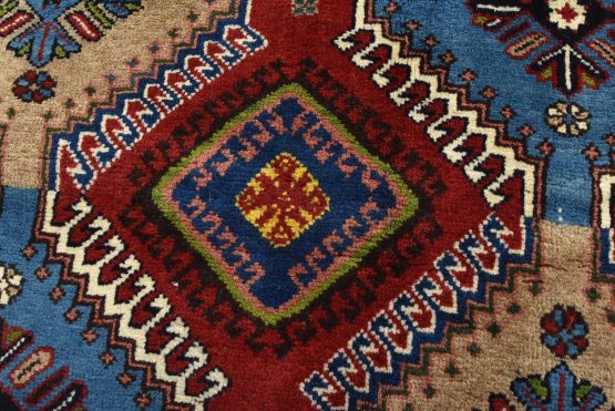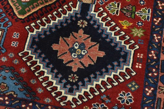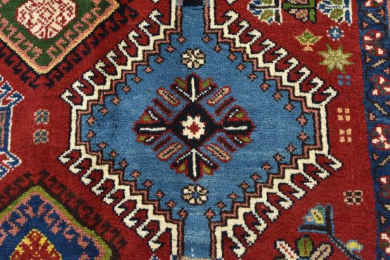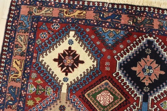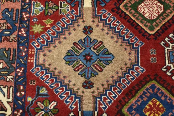 An authentic vintage tribal Yalameh rug hand-knotted with fine wool and natural dyes. This finely woven nomadic rug features rows of geometric medallions surrounded by small geometric botanical motifs set against a red background. It has a full wool pile with no worn areas and is in very good condition.
