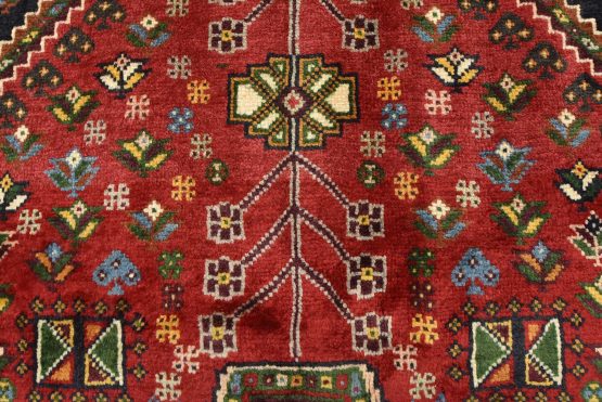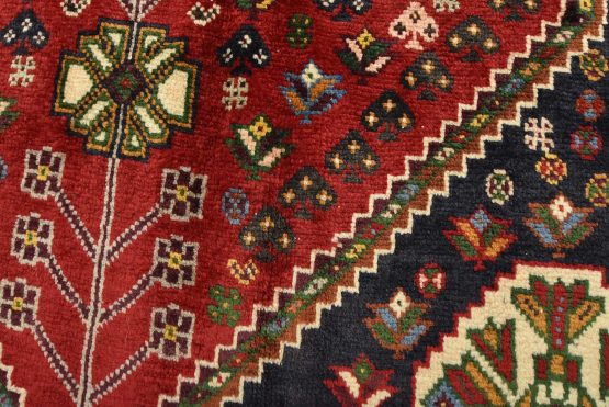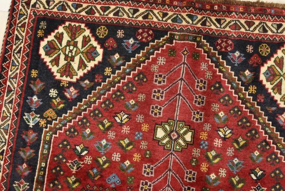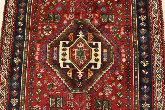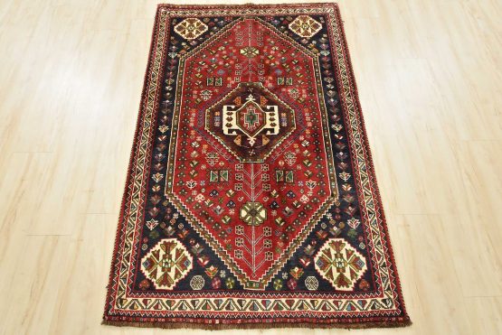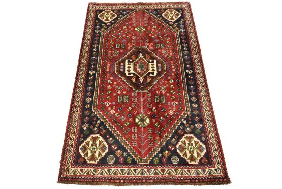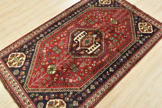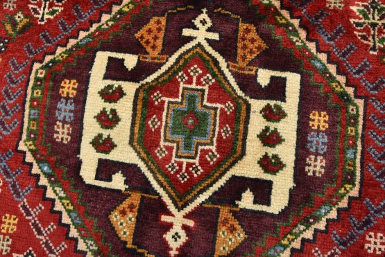 An authentic vintage tribal Qashqai rug hand-knotted with fine wool and natural dyes. This nomadic oriental rug features a central geometric medallion surrounded by small geometric motifs set against a red background. It has a full wool pile with no worn areas and is in very good condition.