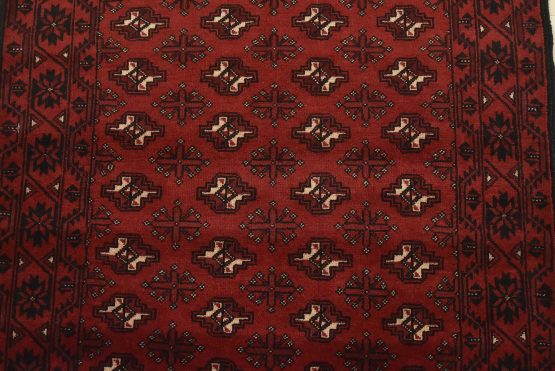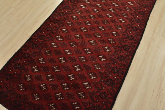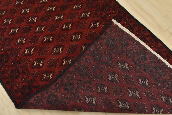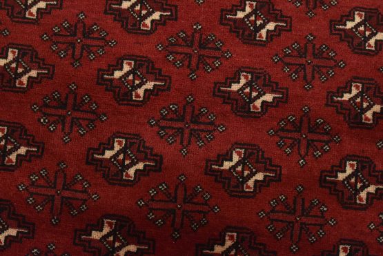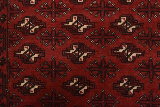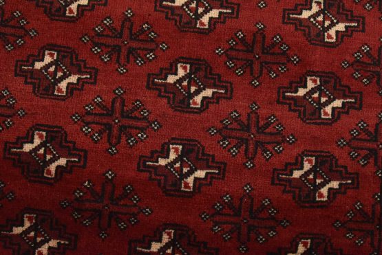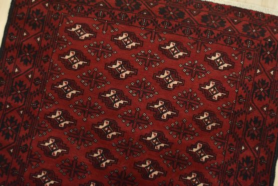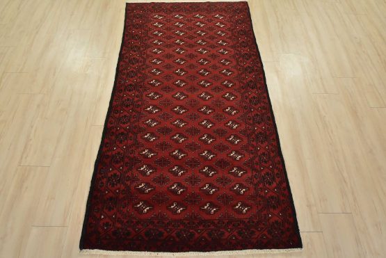 An authentic vintage tribal Baloch rug hand-knotted with fine wool and natural dyes. This nomadic oriental rug features rows of geometric medallions set against a red background. It has a full wool pile with no worn areas and is in very good condition.