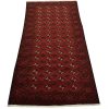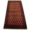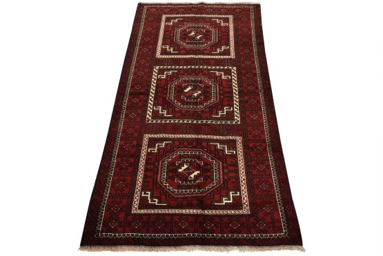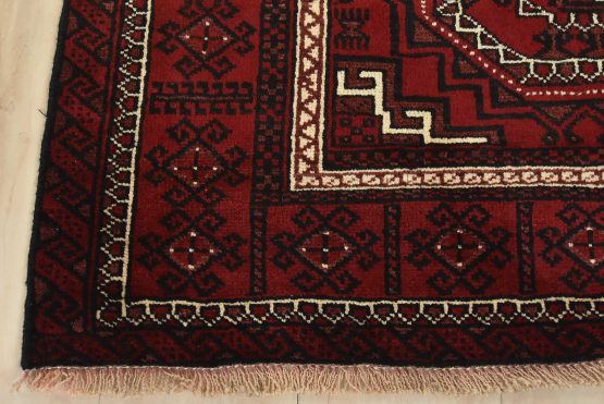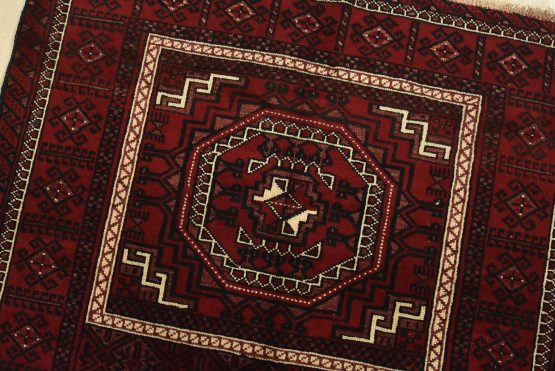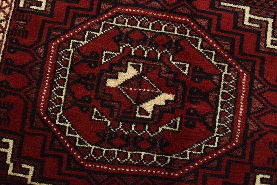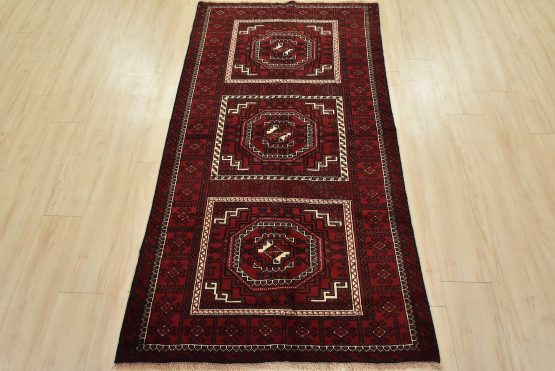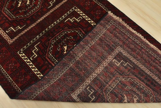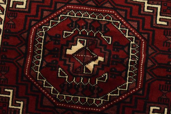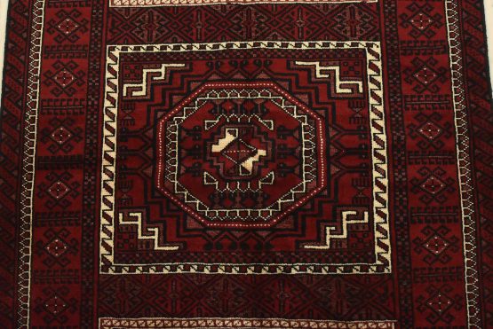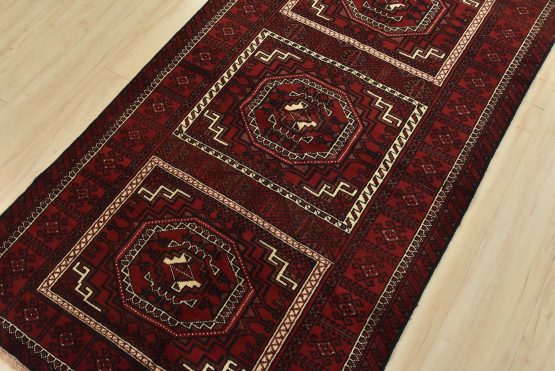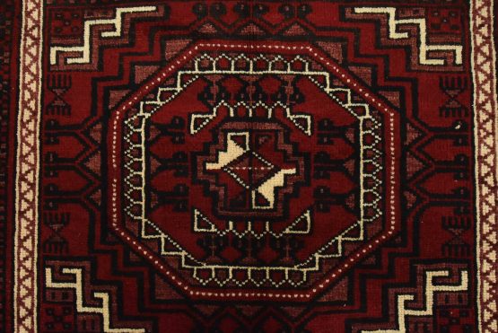 An authentic vintage tribal Baloch rug hand-knotted with fine wool and natural dyes. This nomadic oriental rug features three geometric medallions set against a red background. It has a full wool pile with no worn areas and is in very good condition.