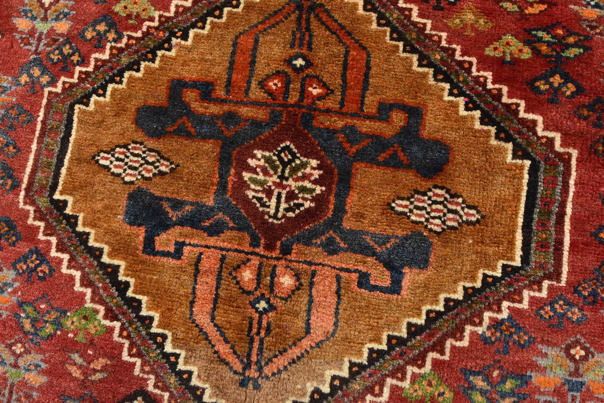 An authentic vintage tribal Qashqai rug hand-knotted with fine wool and natural dyes. This nomadic oriental rug features geometric medallions surrounded by small geometric motifs set against a red background. It has a full wool pile with no worn areas and is in very good condition.