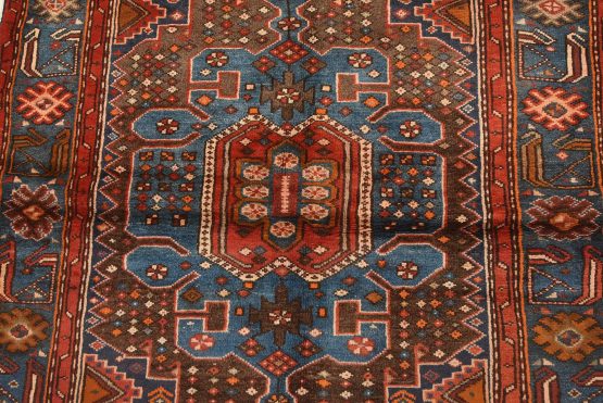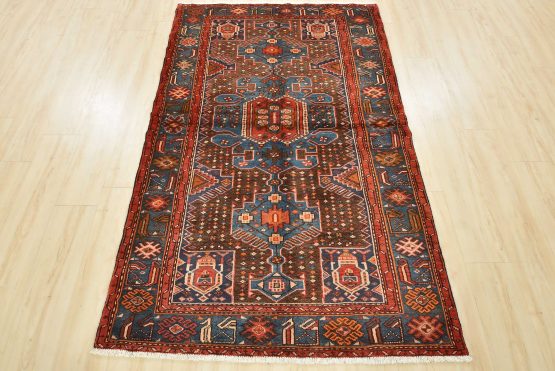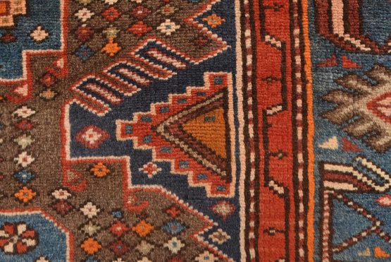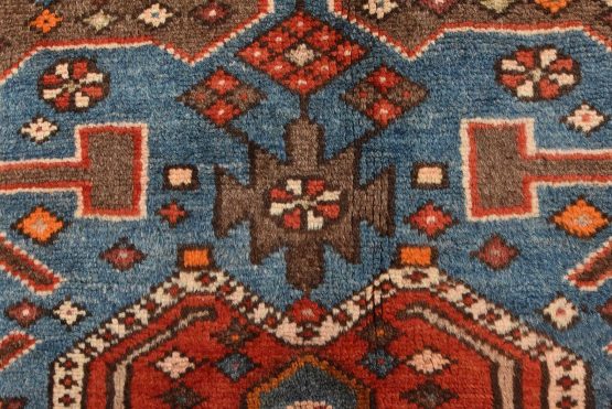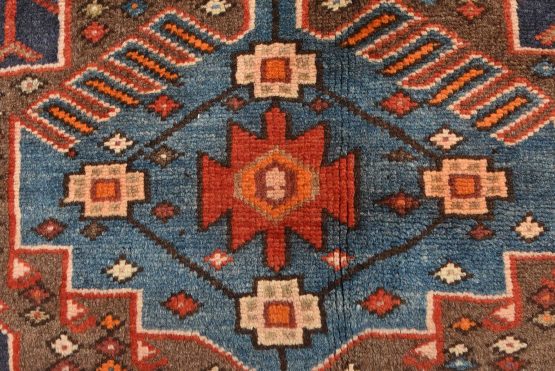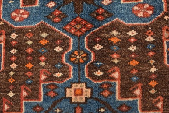 An authentic vintage tribal Zanjan rug hand-knotted with fine wool and natural dyes. This nomadic oriental rug features a central geometric medallion embedded with geometric motifs surrounded by a small-scale diamond-shaped pattern set against a brown background. It has a full wool pile with no worn areas and is in very good condition.