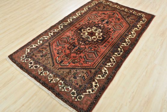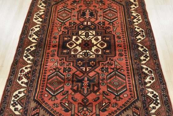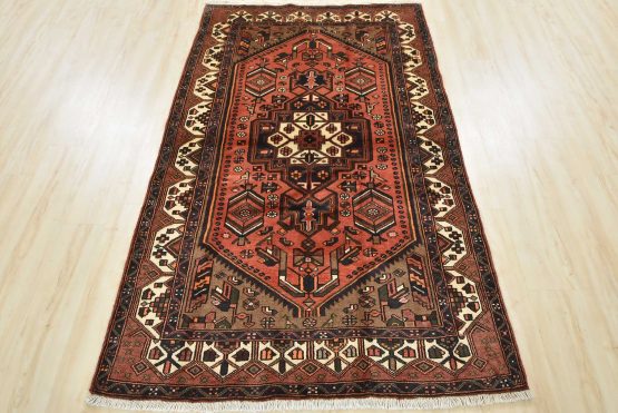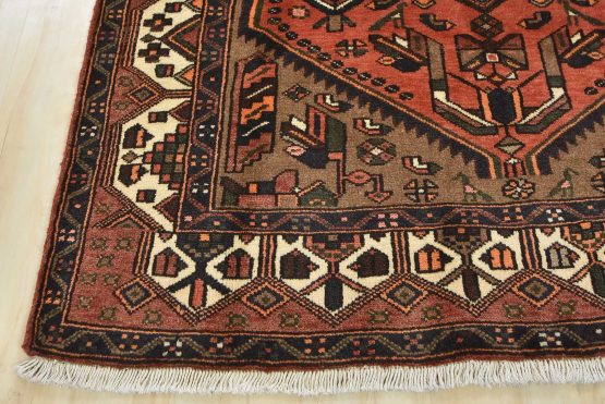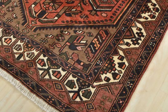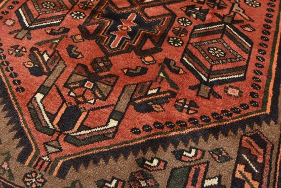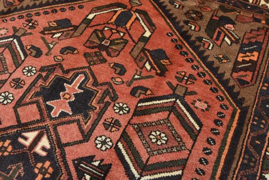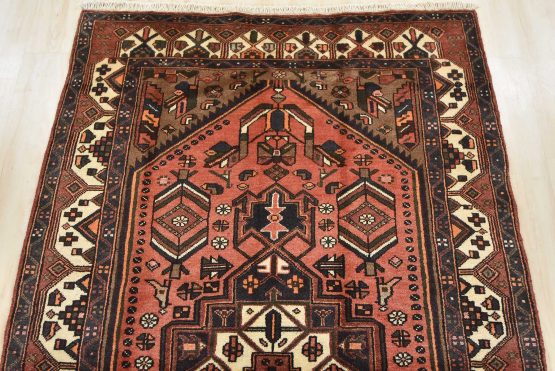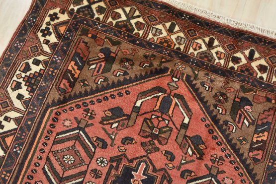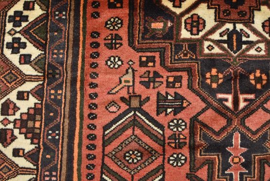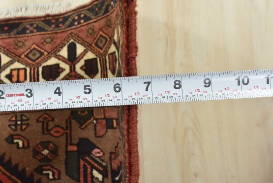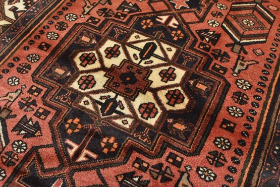 An authentic vintage tribal Hamedan rug hand-knotted with an all-wool pile on a cotton foundation. This nomadic oriental rug features a central geometric medallion surrounded by geometric motifs and bird figures. It has a full wool pile with no worn areas and is in very good condition.