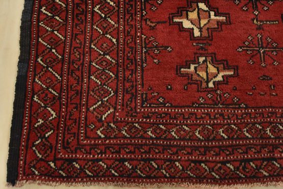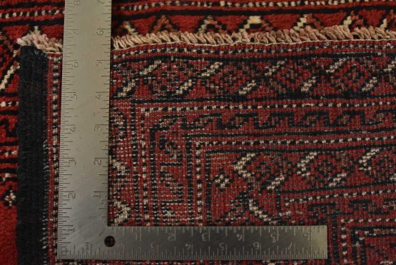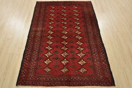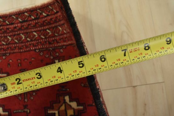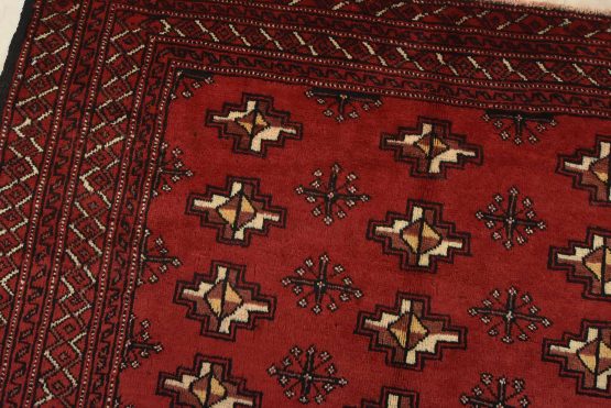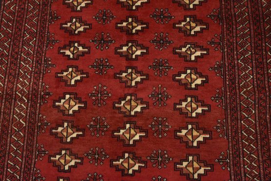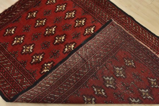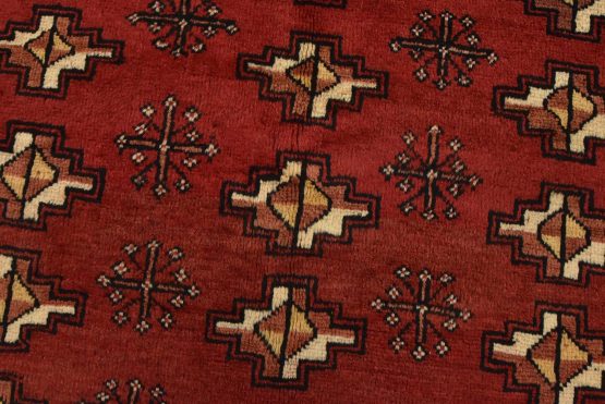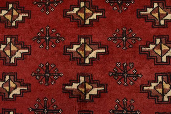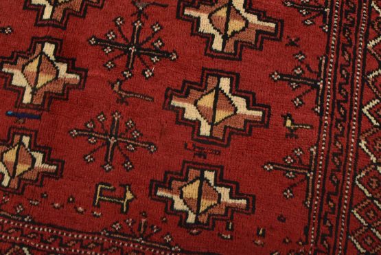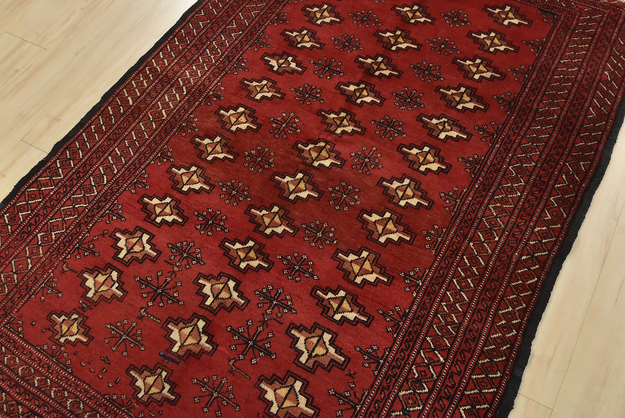 An authentic vintage tribal Turkmen rug hand-knotted with fine wool and natural dyes. This rug features repeating rows of geometric shapes set against a red background. The wool pile shows some minor wear; please refer to the photos. Otherwise, the rug is in very good condition.