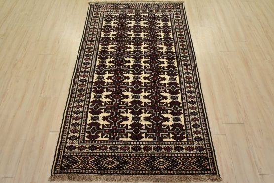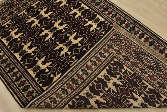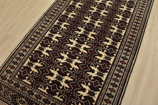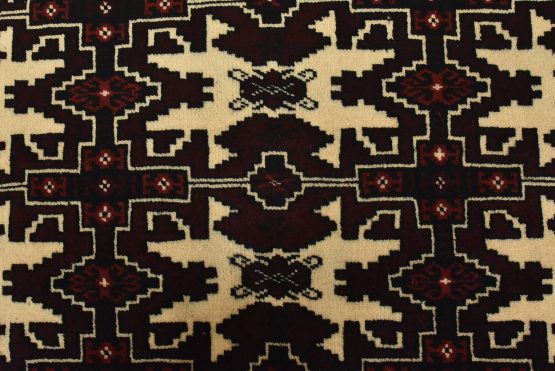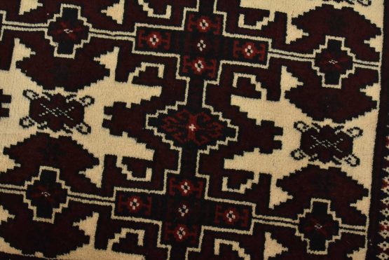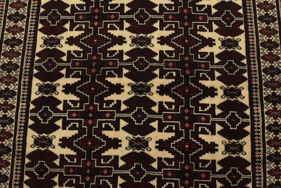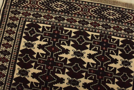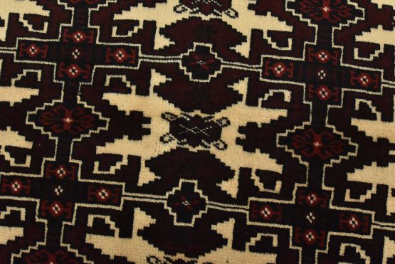 An authentic vintage tribal Turkmen rug hand-knotted with fine wool and natural dyes. This nomadic oriental rug features an all-over geometric pattern set against a beige background. It has a full wool pile with no worn areas and is in very good condition.