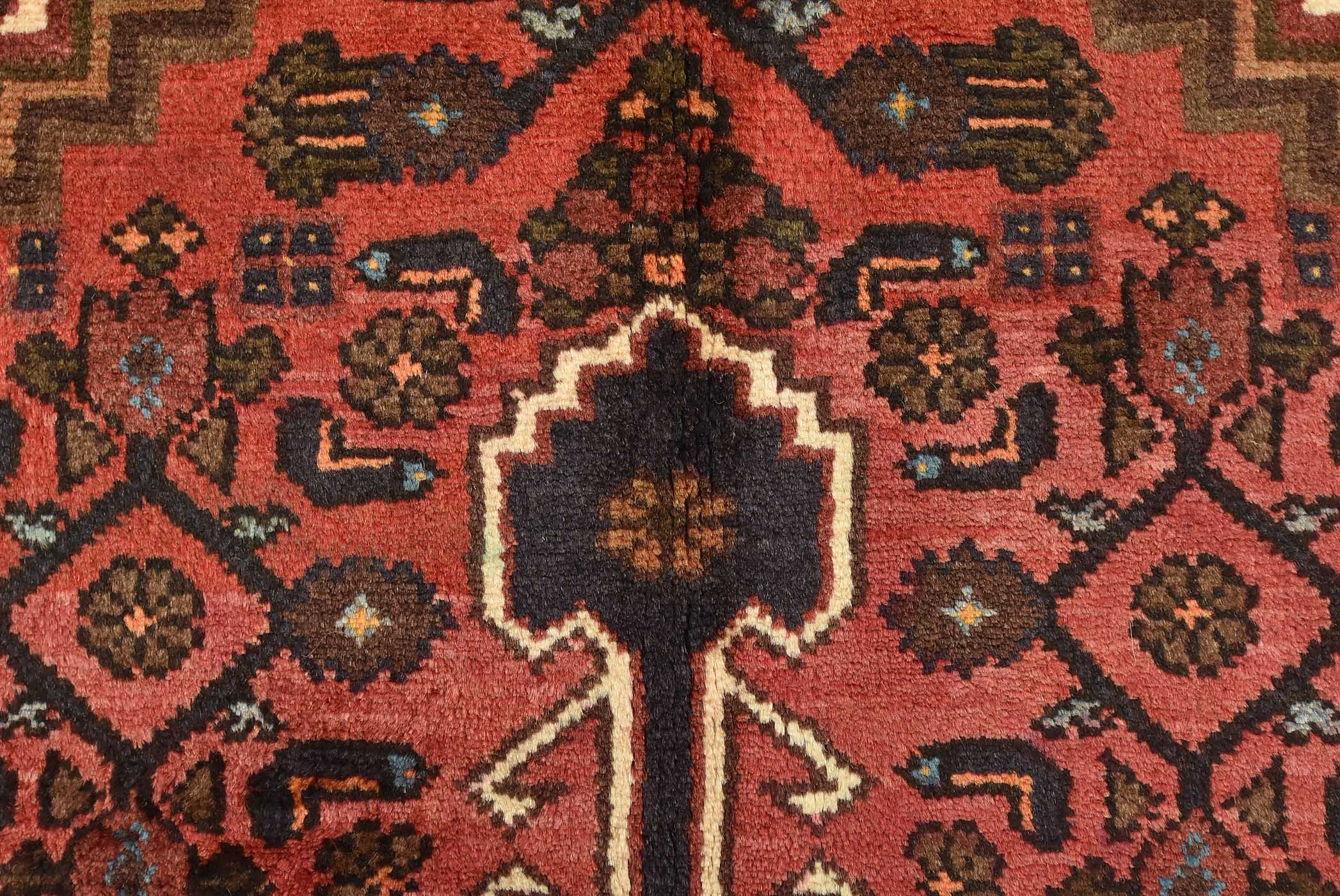 An authentic vintage tribal Hamedan rug hand-knotted with fine wool and natural dyes. This nomadic oriental rug features a central geometric medallion surrounded by a geometric Herati pattern set against a red background. It has a full wool pile with no worn areas and is in very good condition.