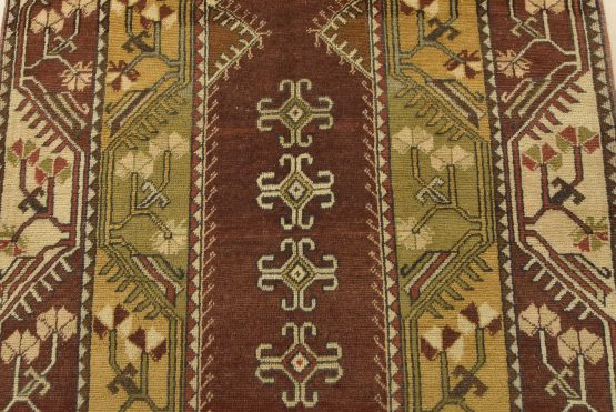 An authentic semi-antique tribal Milas rug hand-knotted with fine wool and natural dyes. This nomadic oriental prayer rug features a row of geometric motifs set against a brown background surrounded by geometric botanical designs. The wool pile and fringe show minor wear; please refer to the photos. Otherwise, this rug is in very good condition.