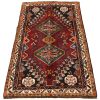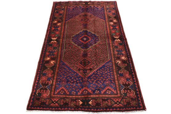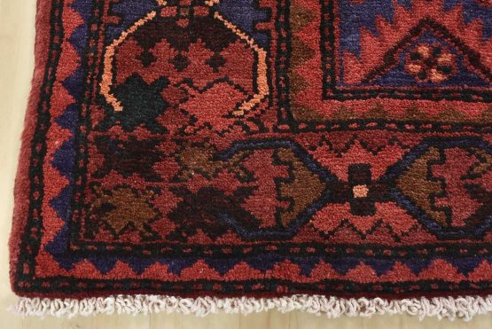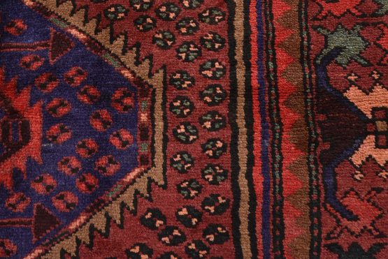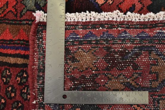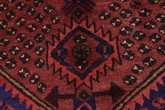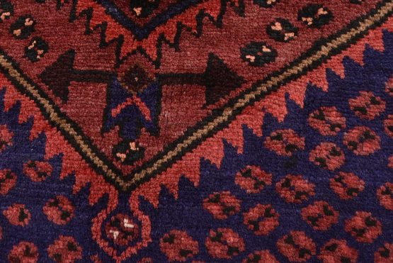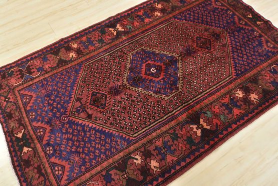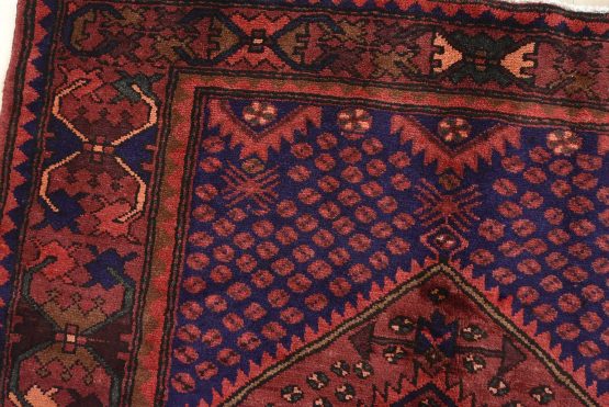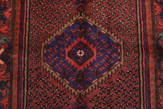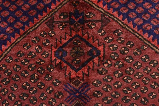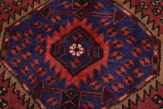 An authentic vintage tribal Hamedan rug hand-knotted with fine wool and natural dyes. This nomadic oriental rug features a central geometric medallion surrounded by a pattern of dots set against a red background. It has a full wool pile with no worn areas and is in very good condition.