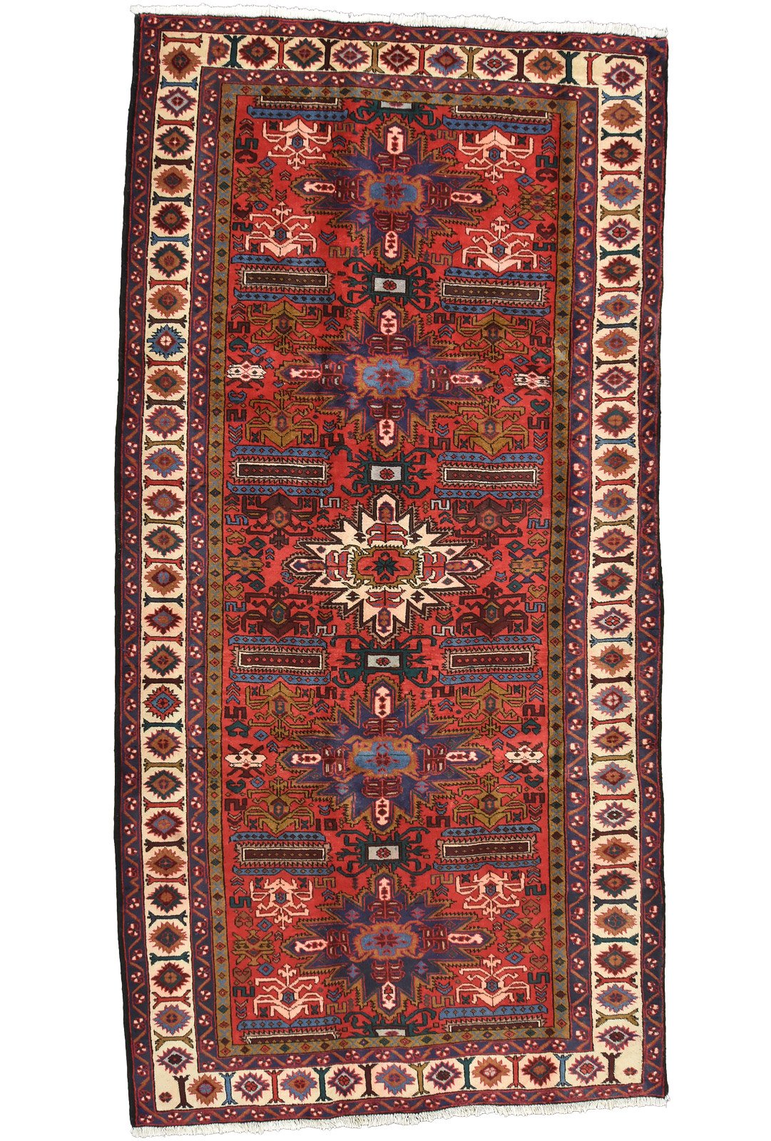 An authentic vintage tribal Karajeh rug hand-knotted with fine wool and natural dyes. This nomadic oriental rug features a row of geometric medallions surrounded by geometric motifs set against a red background. The wool pile shows some minor wear; please refer to the photos. Otherwise, the rug is in very good condition.