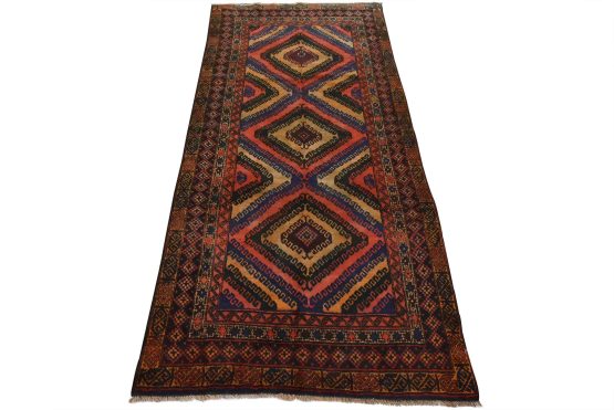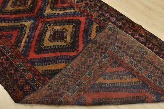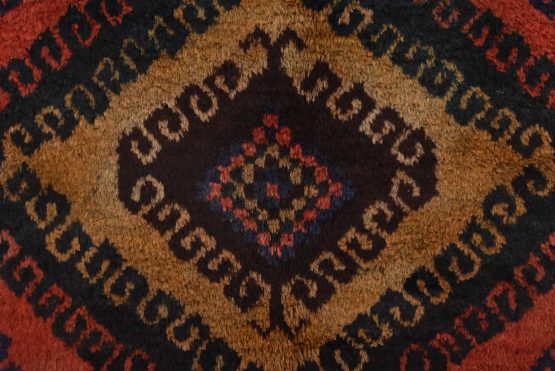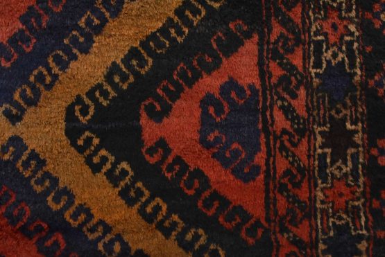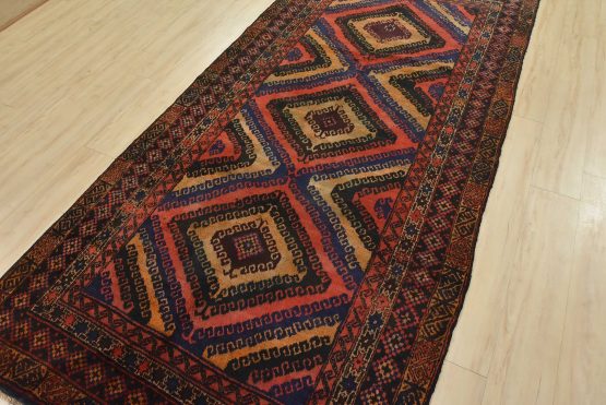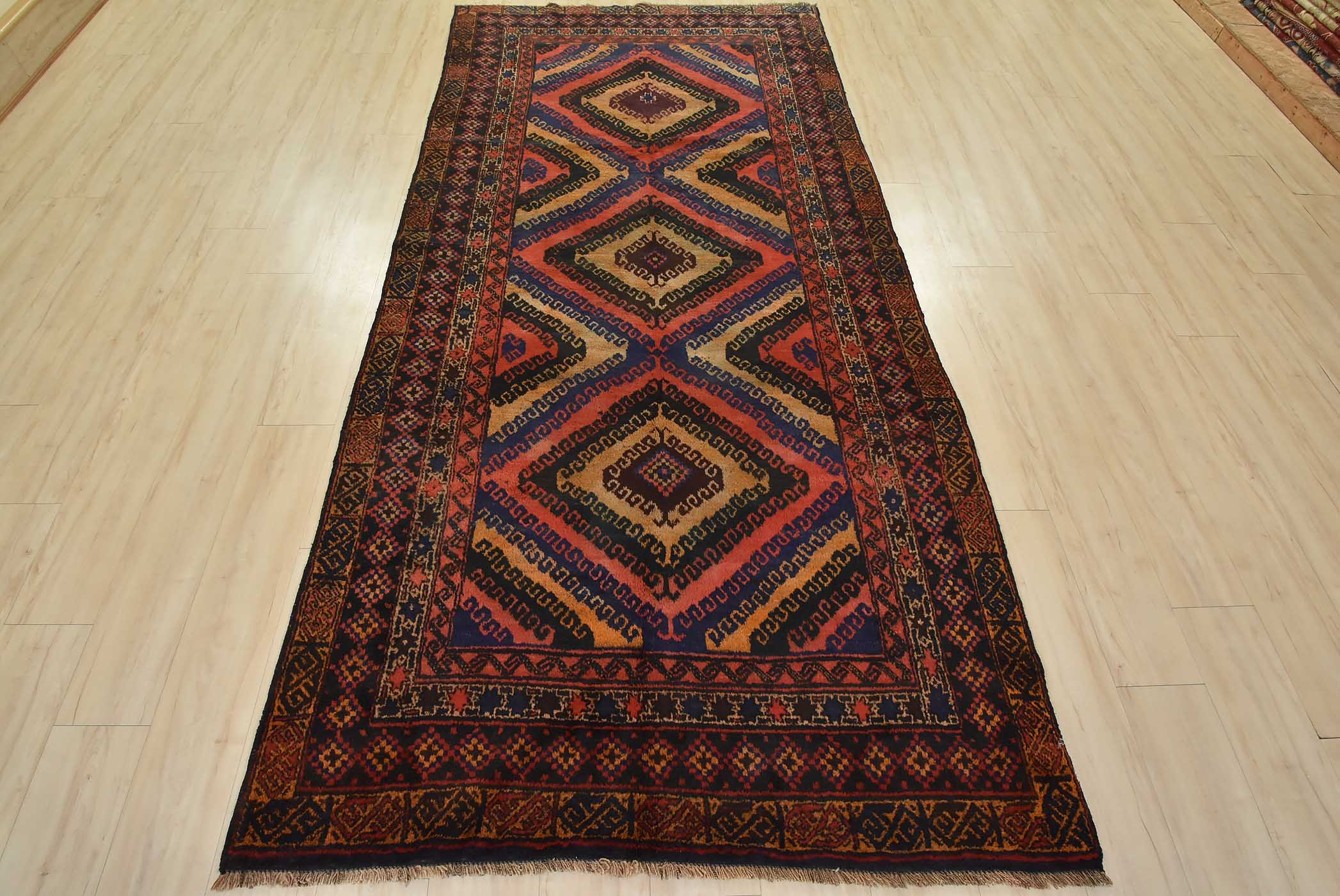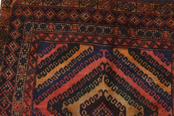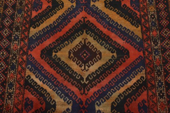 An authentic vintage tribal Baloch rug hand-knotted with fine wool and natural dyes. This nomadic oriental rug features three geometric diamond-shaped medallions in a row. There is some minor wear on the wool pile; see photos. Otherwise, this rug is in very good condition.