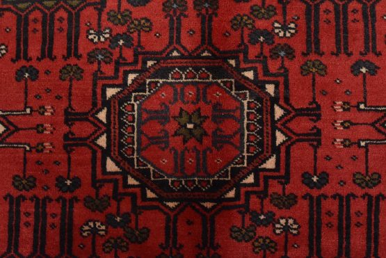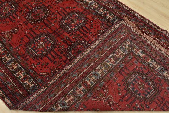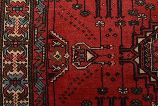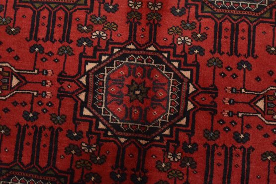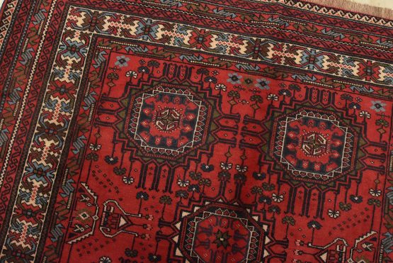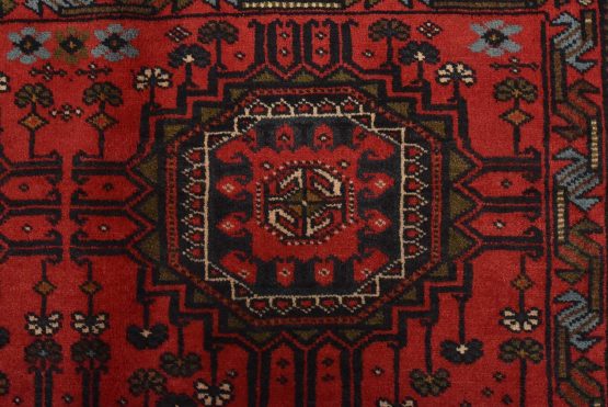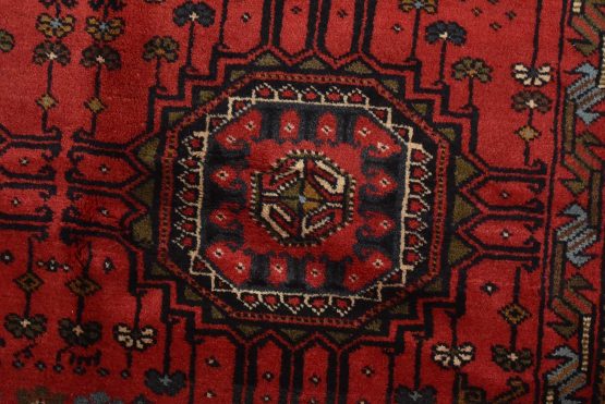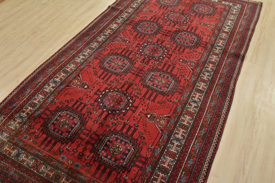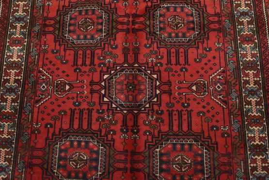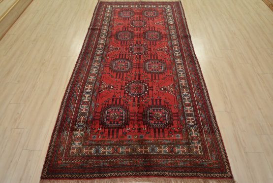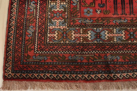 An authentic vintage tribal Baloch rug hand-knotted with fine wool and natural dyes. This nomadic oriental rug features rows of geometric medallions set against a red background. It has a full wool pile with no worn areas and is in very good condition.