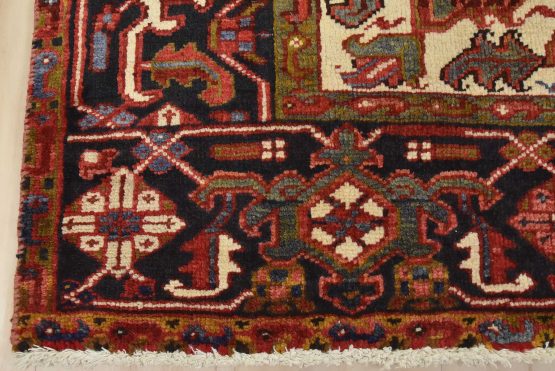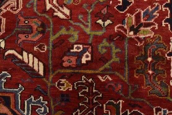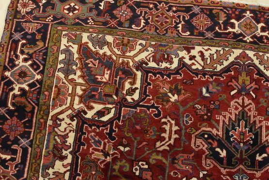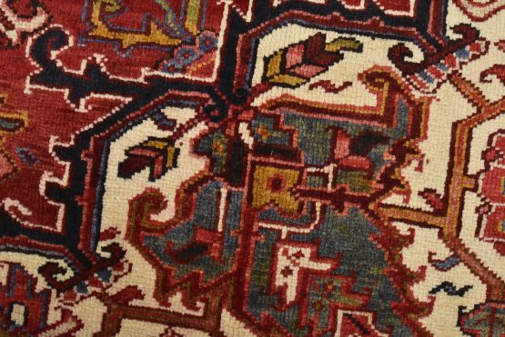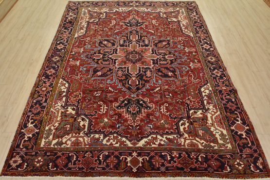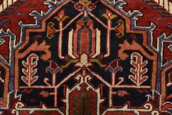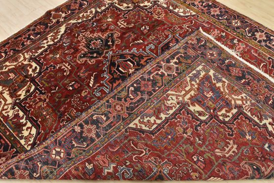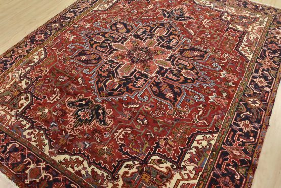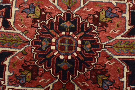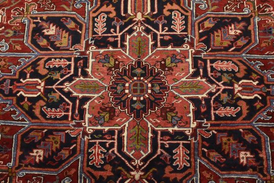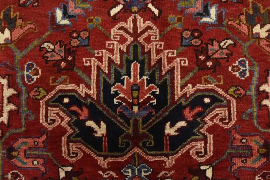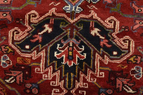 An authentic vintage traditional Heriz rug hand-knotted with fine wool and natural dyes. This beautiful oriental rug features a large central medallion surrounded by botanical patterns set against a red background. It has a full wool pile with no worn areas and is in very good condition.
