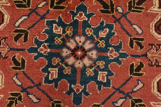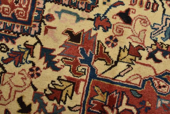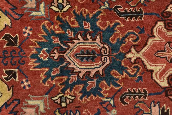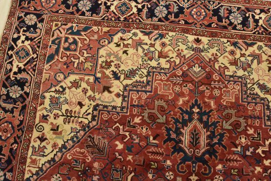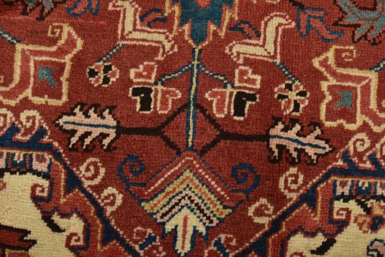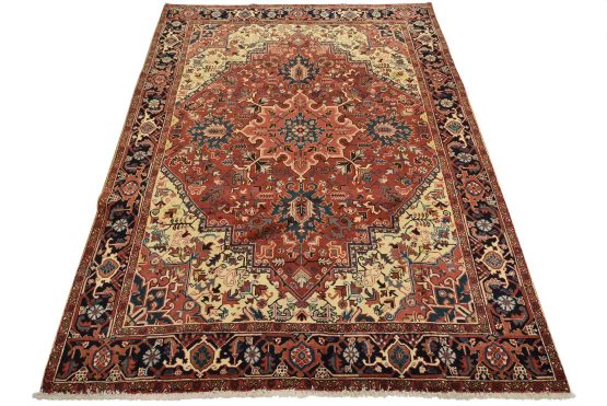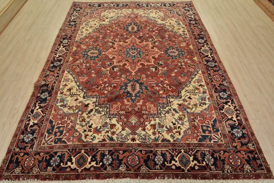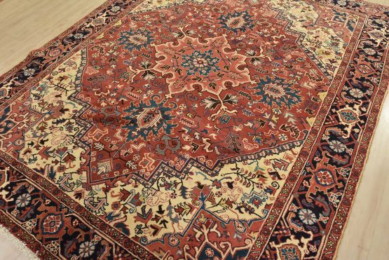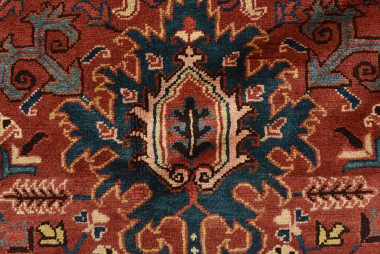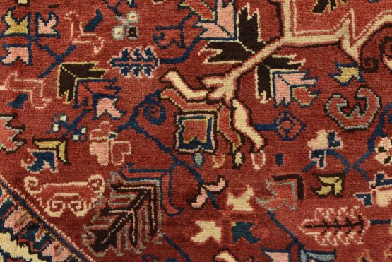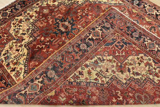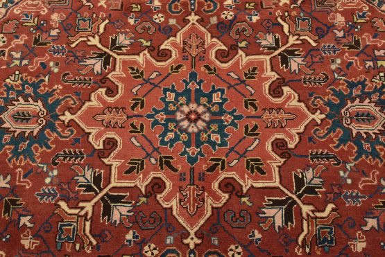 An authentic vintage traditional Heriz rug hand-knotted with fine wool and natural dyes. This oriental rug features a central medallion surrounded by botanical designs set against a red background. It has a full wool pile with no worn areas and is in very good condition.