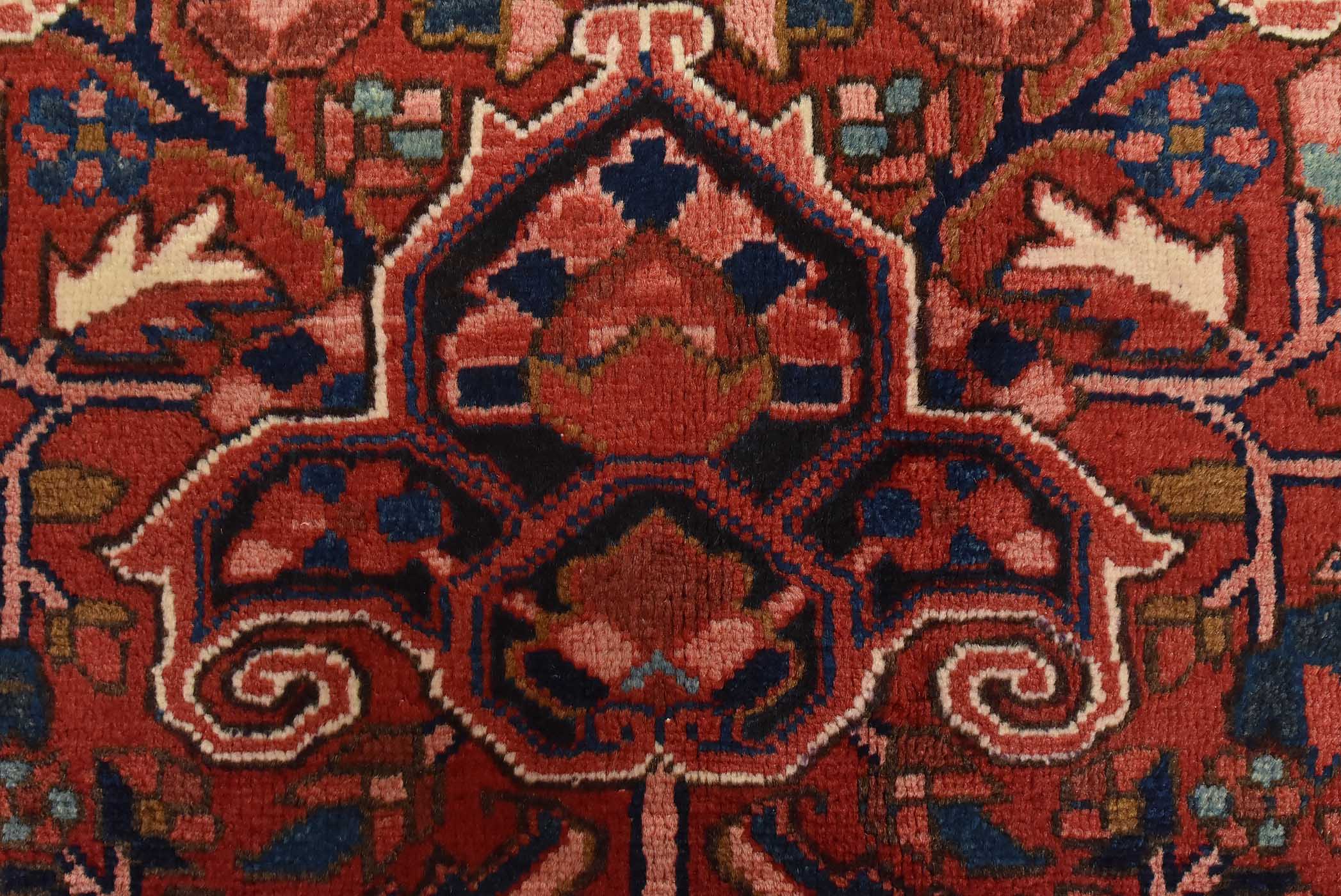 An authentic vintage traditional Heriz rug hand-knotted with fine wool and natural dyes. This stunning oriental rug features a geometric central medallion surrounded by floral botanical designs set against a red background. It has a full wool pile with no worn areas and is in very good condition.
