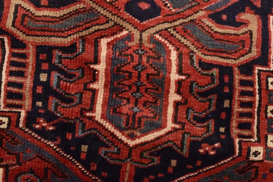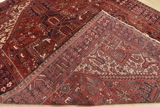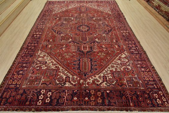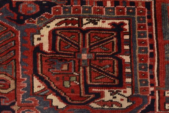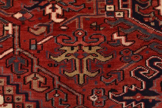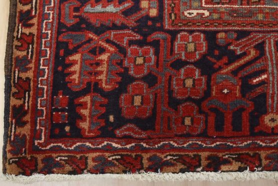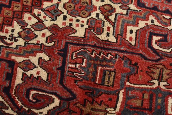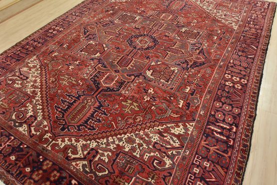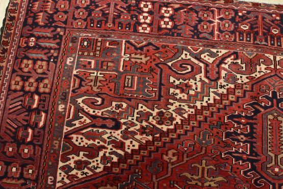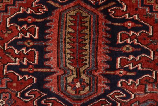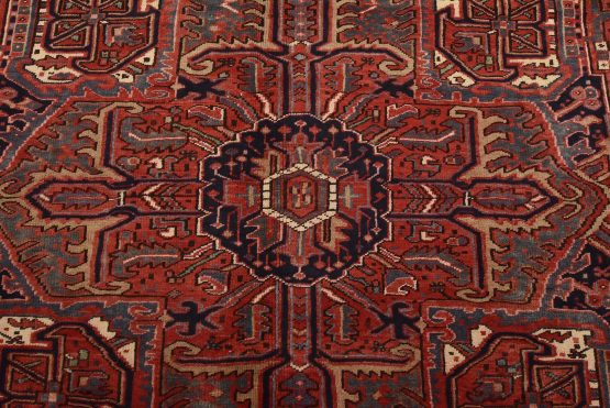 An authentic vintage traditional tribal Heriz rug hand-knotted with fine wool and natural dyes. This nomadic oriental rug features a large central medallion surrounded by geometric botanical designs set against a red background. It has a full wool pile with no worn areas and is in very good condition.