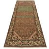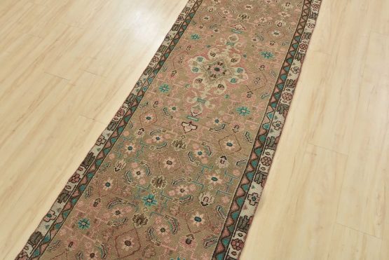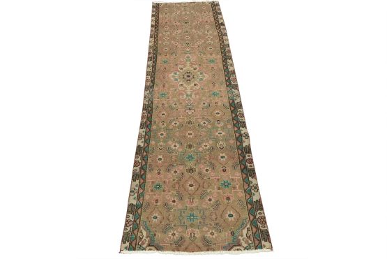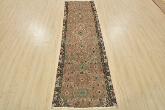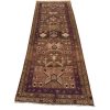 An authentic semi-antique tribal Hamedan runner hand-knotted with fine wool and natural dyes. This oriental rug features muted colors with a central medallion surrounded by a geometric Herati pattern set against a brown background. It has a low wool pile, is worn and distressed, and has minor imperfections (see photos). However, it is in very good condition.
