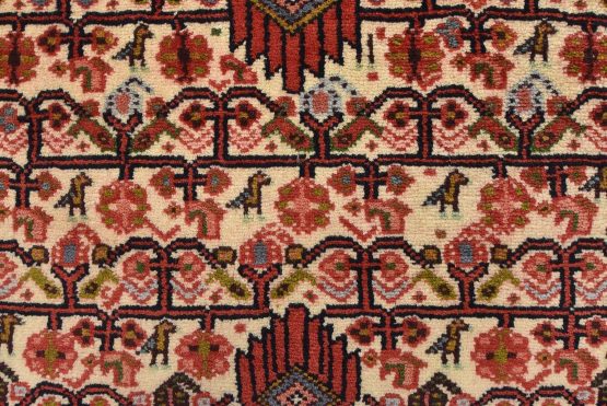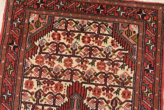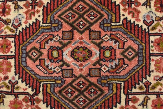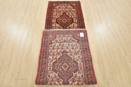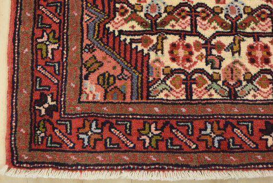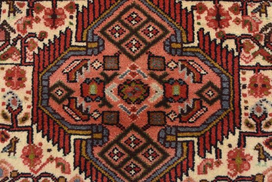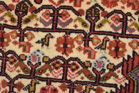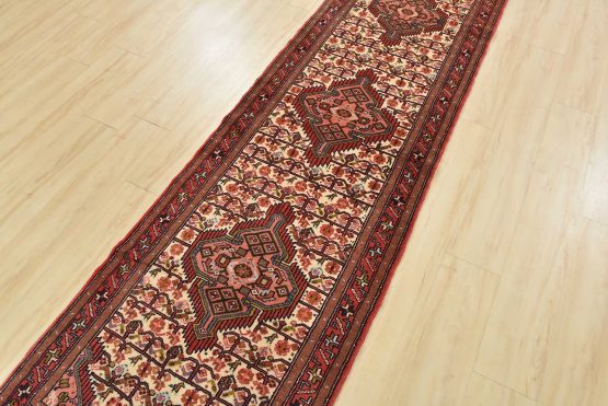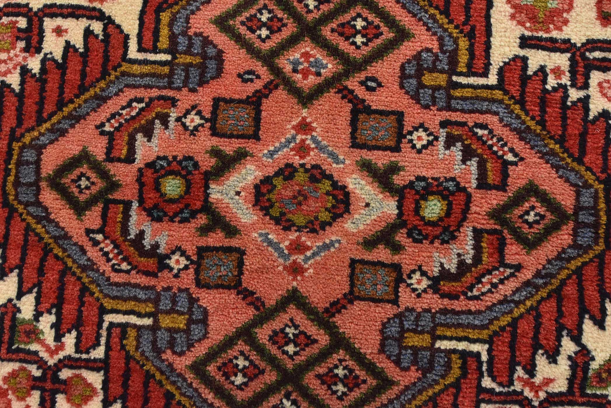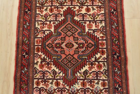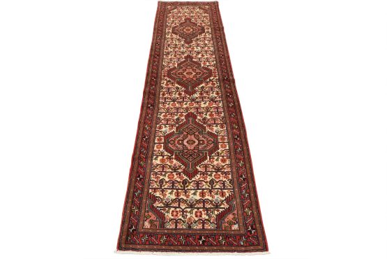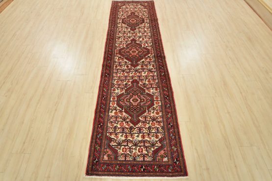 An authentic vintage tribal Hamedan runner hand-knotted with fine wool and natural dyes. This nomadic oriental rug features geometric medallions surrounded by a botanical pattern with geometric bird figures set against an ivory background. It has a full wool pile with no worn areas and is in very good condition.
