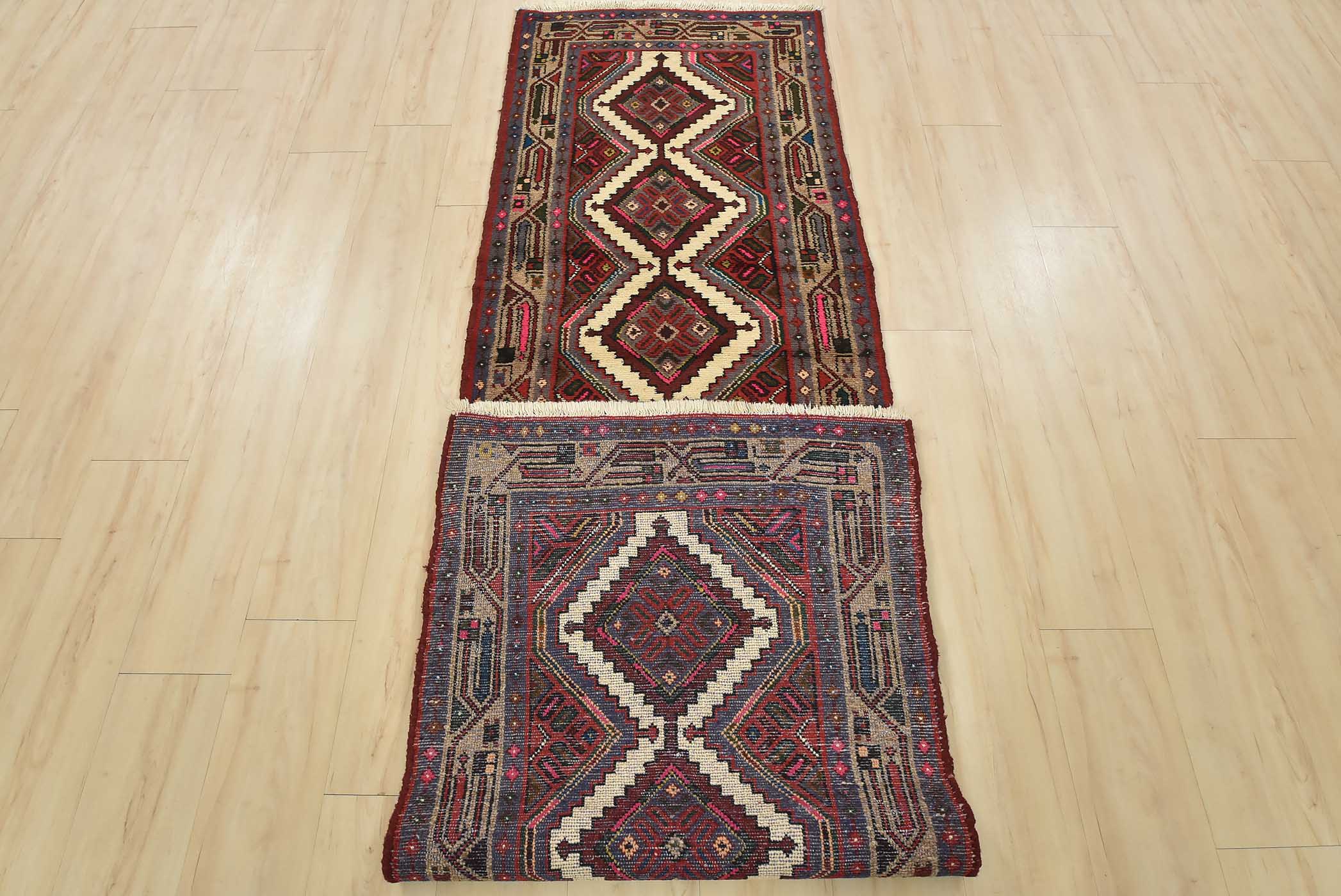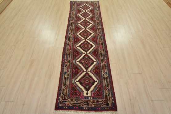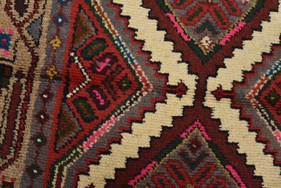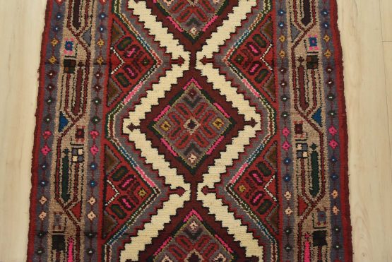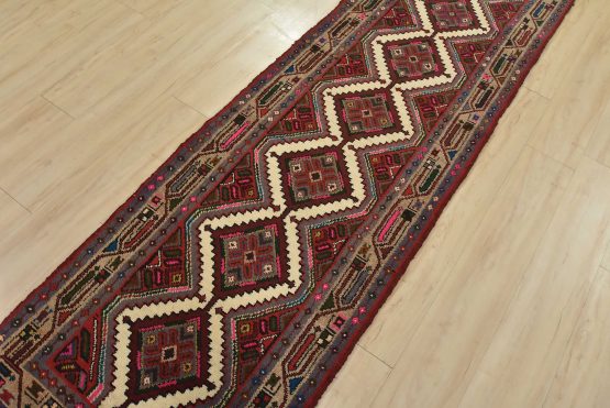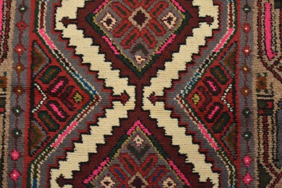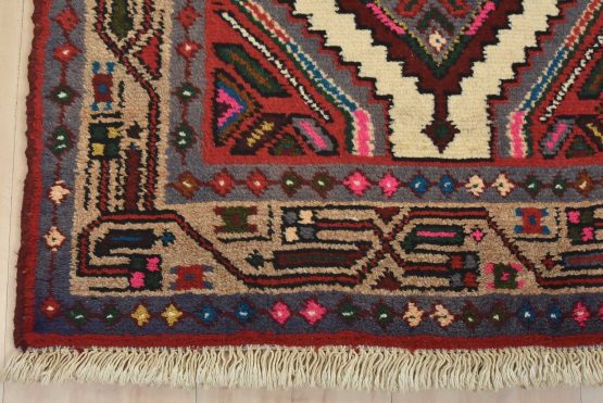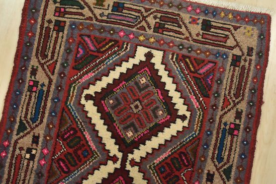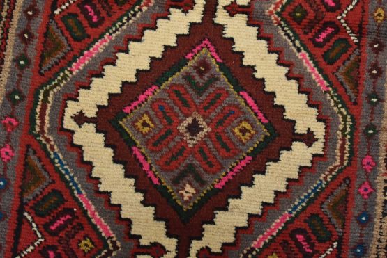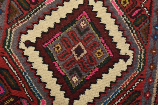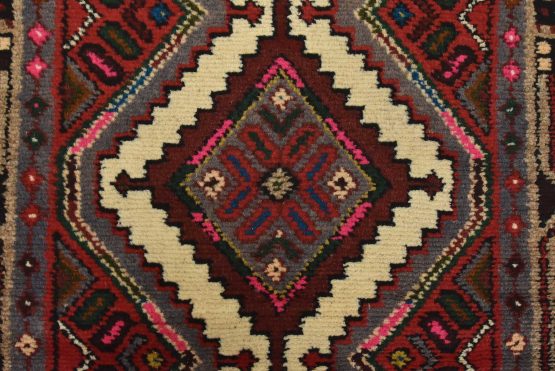 An authentic vintage tribal Hamedan runner hand-knotted with fine wool and natural dyes. This nomadic oriental rug features a row of geometric medallions set against a red background. The wool pile shows some minor wear; see photos. Otherwise, this rug is in very good condition.