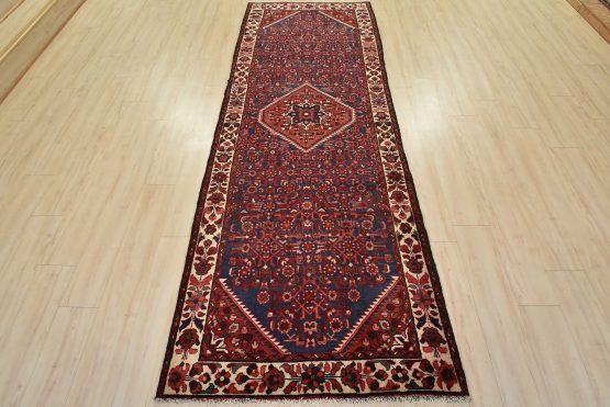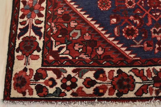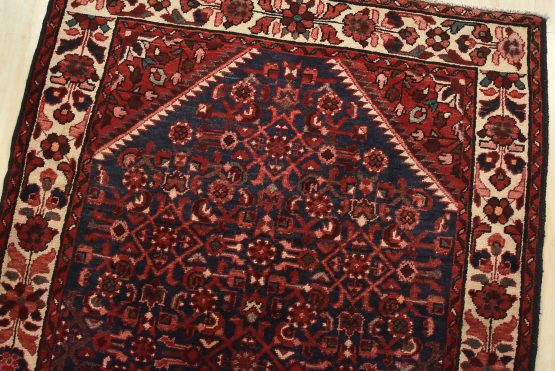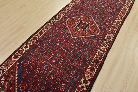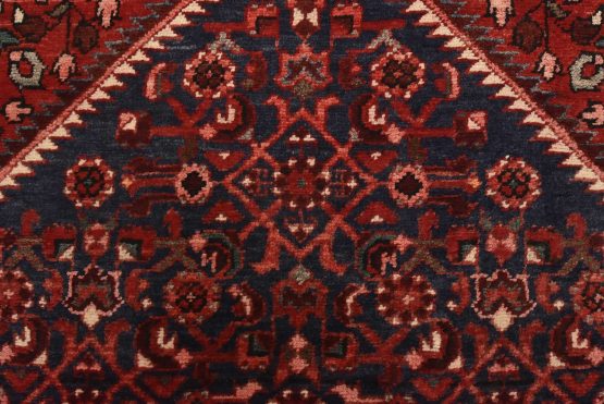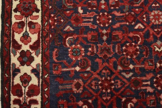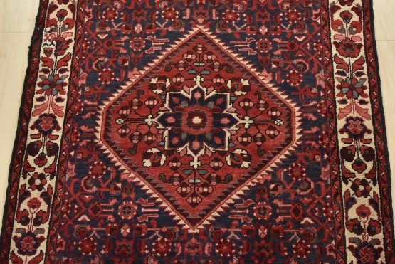 An authentic semi-antique tribal Hamedan runner hand-knotted with fine wool and natural dyes. This nomadic oriental rug features a central geometric medallion surrounded by a Herati pattern set against a dark blue background. The wool pile shows some minor wear; please refer to the photos. Otherwise, the rug is in very good condition.