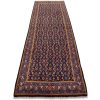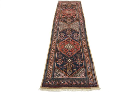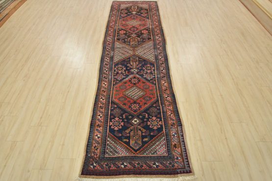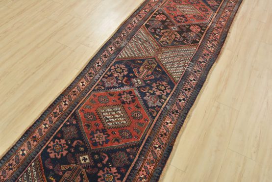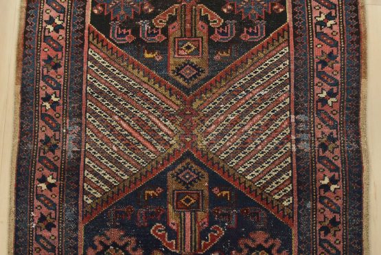 An authentic semi-antique tribal Sarab runner hand-knotted with fine wool and natural dyes. This nomadic oriental rug features two medallions surrounded by geometric flowers and shapes set against a blue background. The wool pile shows some minor wear and has been repaired; please refer to the photos. Otherwise, this rug is in very good condition.