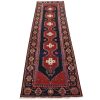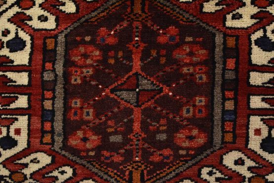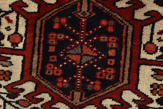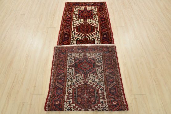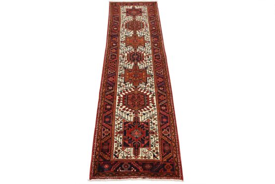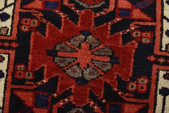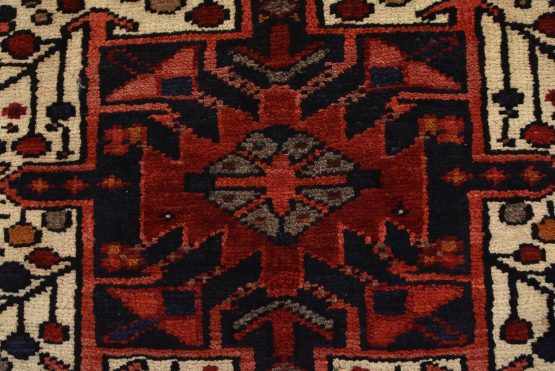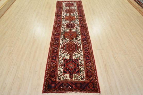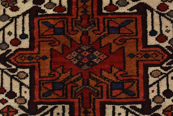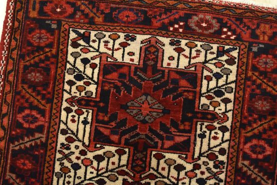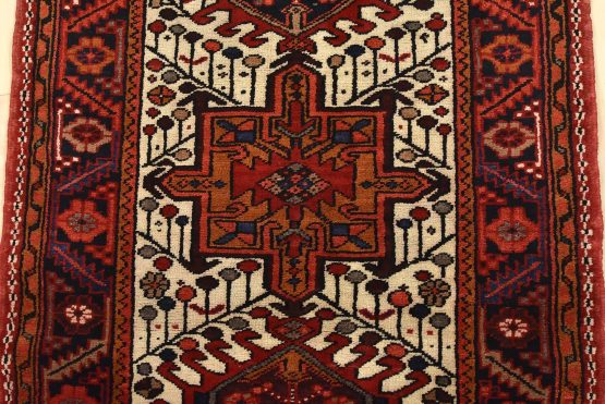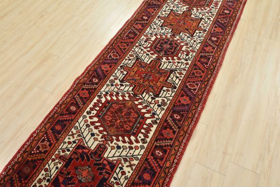 An authentic semi-antique tribal Karajeh runner hand-knotted with fine wool and natural dyes. This nomadic oriental rug features a row of geometric medallions surrounded by a geometric botanical design set against an ivory background. The wool pile shows some minor wear; please refer to the photos. Otherwise, this rug is in very good condition.
