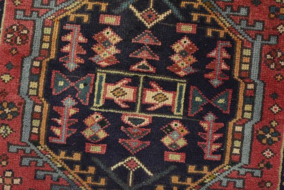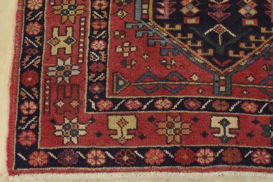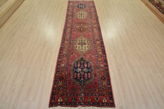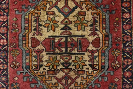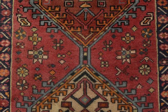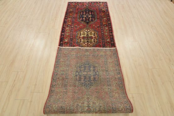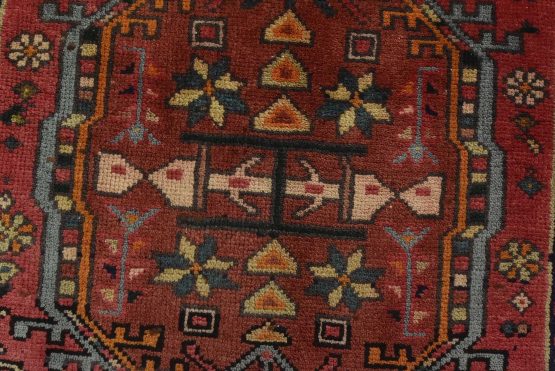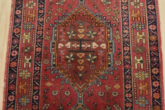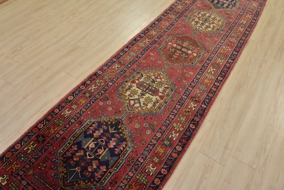 An authentic semi-antique tribal Karajeh runner hand-knotted with fine wool and natural dyes. This nomadic oriental rug features a row of medallions surrounded by geometric motifs set against a red background. The wool pile shows some minor wear; please refer to the photos. Otherwise, the rug is in very good condition.
