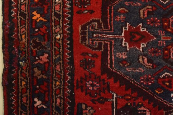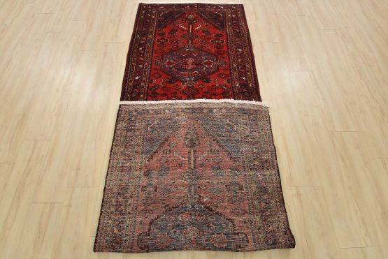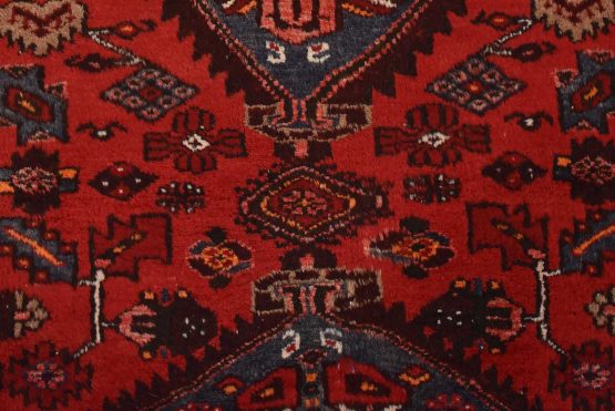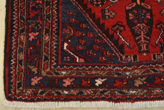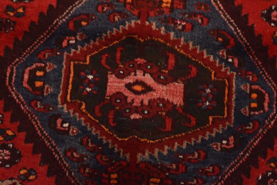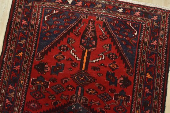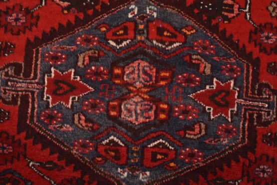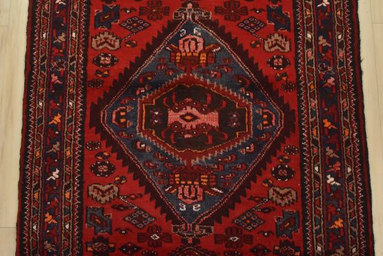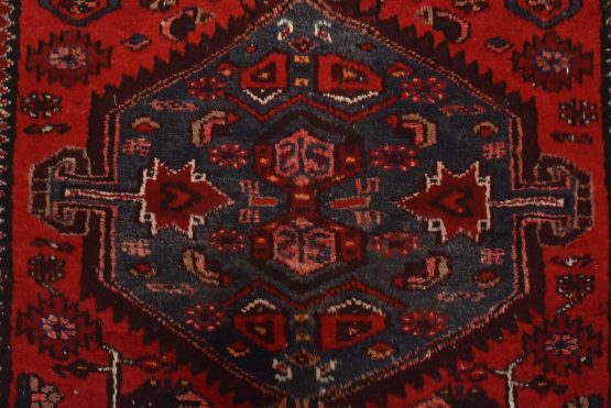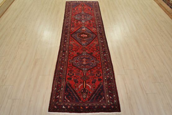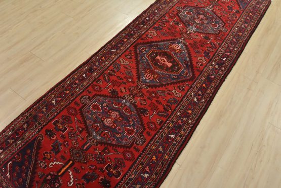 An authentic vintage tribal Zanjan runner hand-knotted with fine wool and natural dyes. This nomadic oriental rug features three medallions surrounded by geometric motifs set against a red background. The wool pile shows some minor wear; please refer to the photos. Otherwise, the rug is in very good condition.