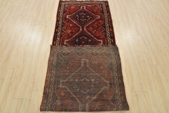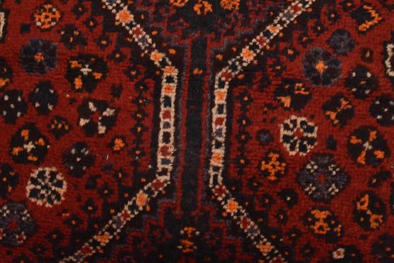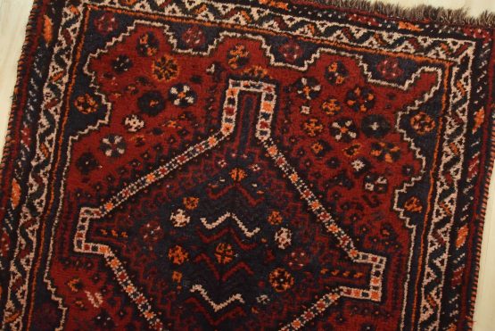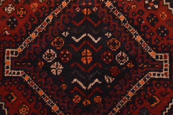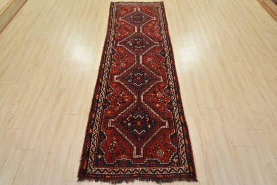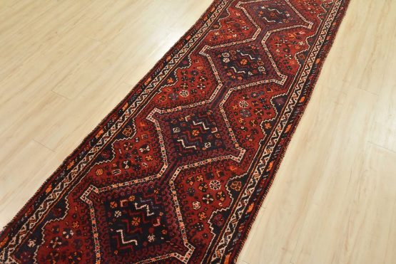 An authentic vintage tribal Shiraz runner hand-knotted with fine wool and natural dyes. This nomadic oriental rug features a row of geometric medallions set against a red background. The wool pile shows some minor wear; please refer to the photos. Otherwise, the rug is in very good condition.