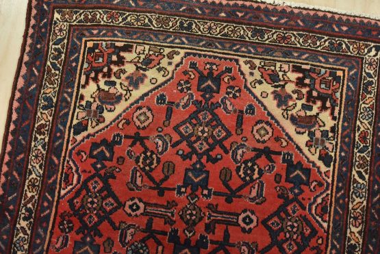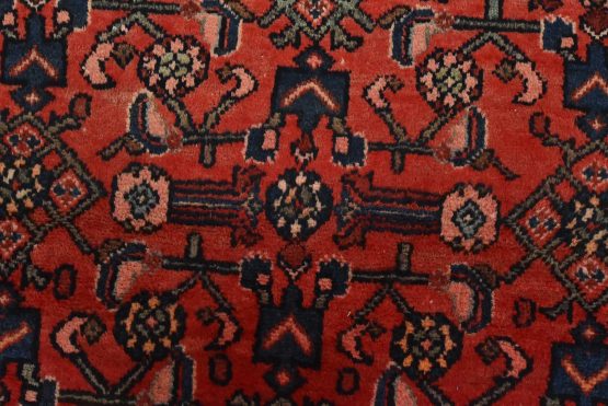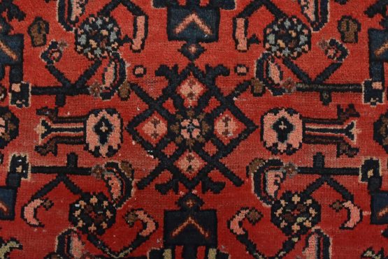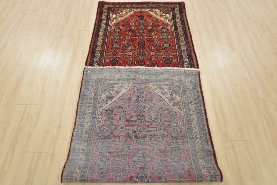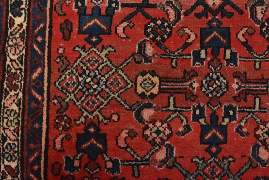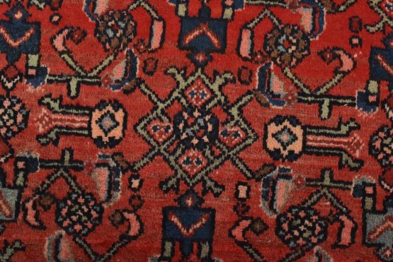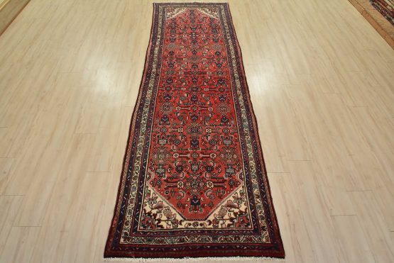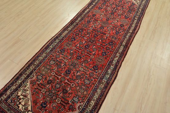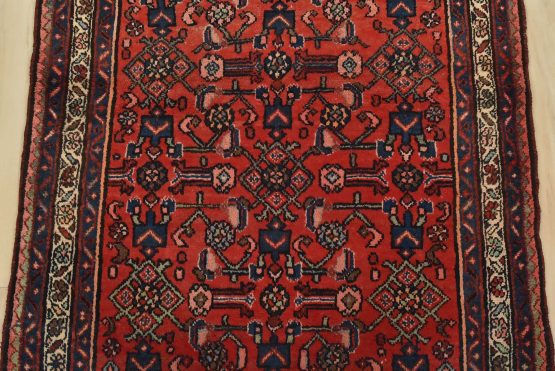 An authentic semi-antique tribal Hamedan runner hand-knotted with fine wool and natural dyes. This rug features an all-over geometric Herati pattern set against a red background. The wool pile shows some minor wear; please refer to the photos. Otherwise, the rug is in very good condition.