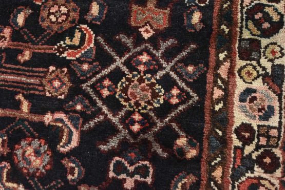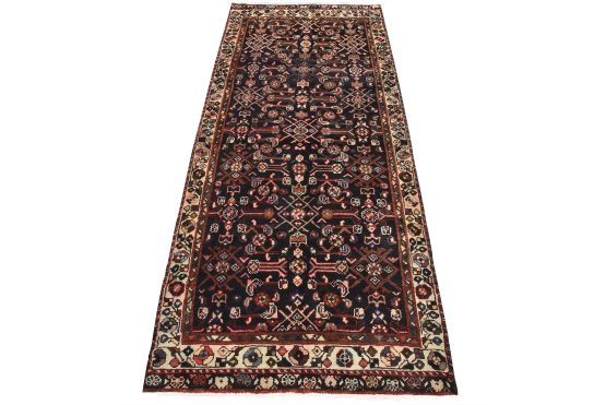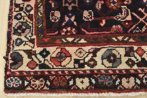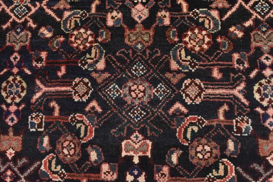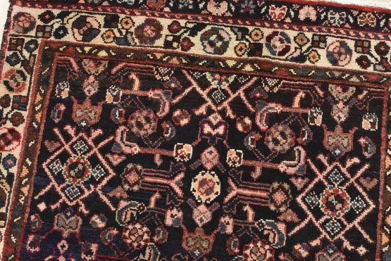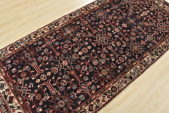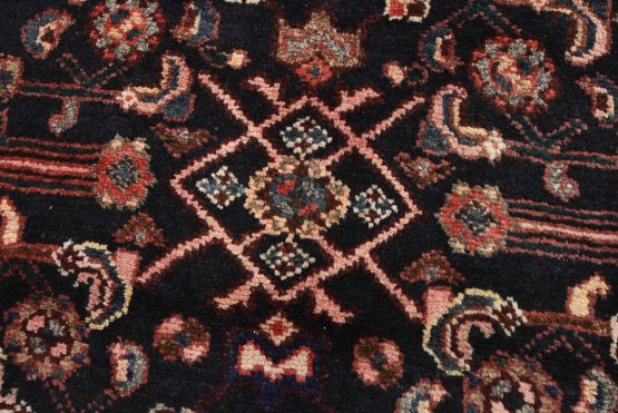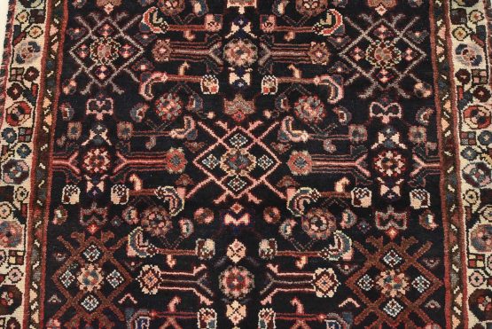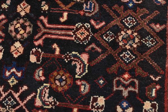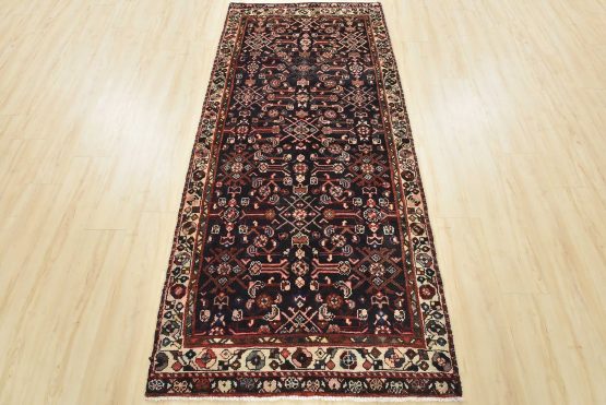 An authentic vintage tribal Hamedan runner hand-knotted with fine wool and natural dyes. This nomadic oriental rug features an all-over geometric Herati pattern set against a dark blue background. The wool pile and edge do show some minor wear; please refer to the photos. Otherwise, this rug is in very good condition.