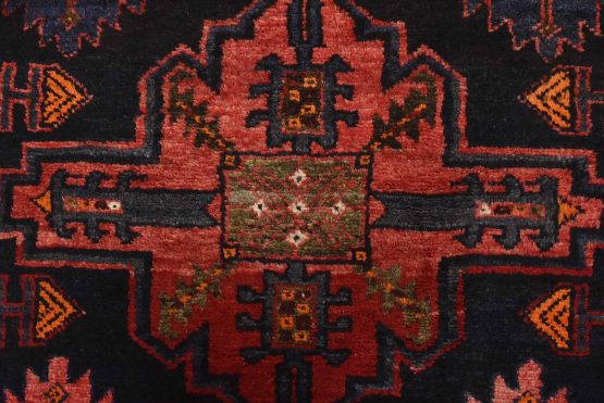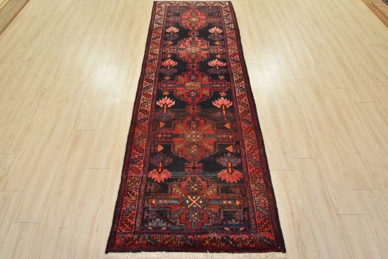 An authentic semi-antique tribal Zanjan runner hand-knotted with fine wool and natural dyes. This nomadic oriental rug features a row of medallions surrounded by geometric motifs set against a dark blue background. The wool pile shows some minor wear; please refer to the photos. Otherwise, the rug is in very good condition.