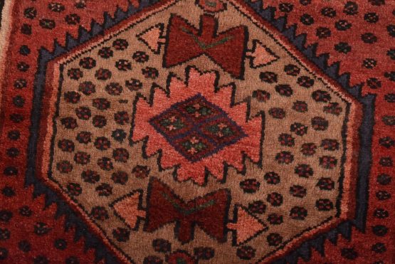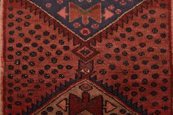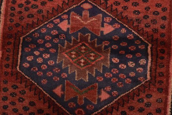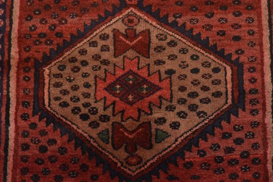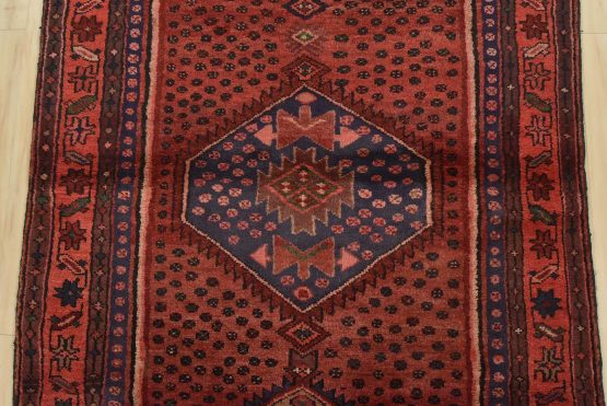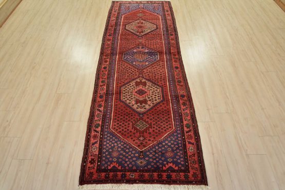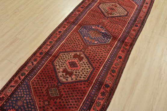 An authentic vintage tribal Zanjan runner hand-knotted with fine wool and natural dyes. This nomadic oriental rug features three geometric medallions surrounded by a small-scale dot design. The wool pile shows some minor wear; please refer to the photos. Otherwise, the rug is in very good condition.