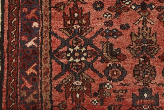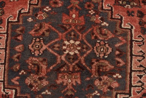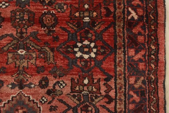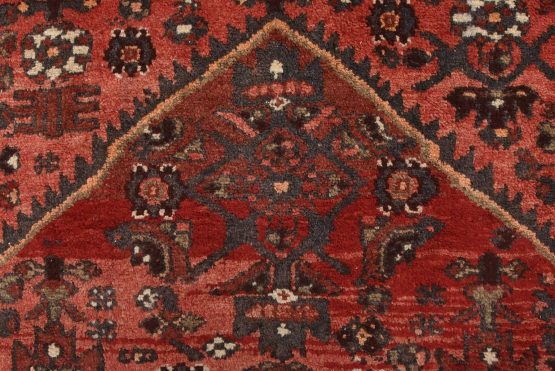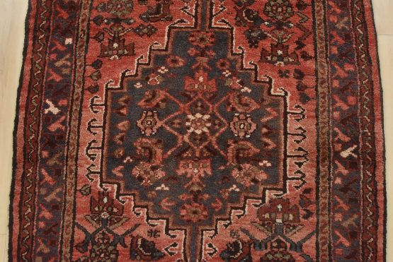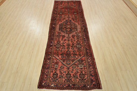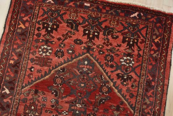 An authentic vintage tribal Hamedan runner hand-knotted with fine wool and natural dyes. This nomadic oriental rug features a central geometric medallion surrounded by a Herati pattern set against a red background. The wool pile shows some minor wear; please refer to the photos. Otherwise, the rug is in very good condition.