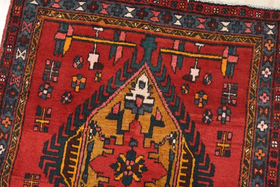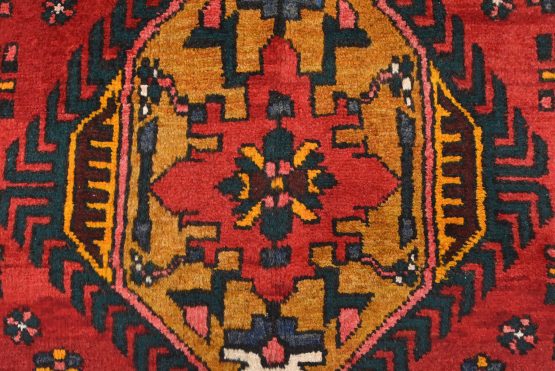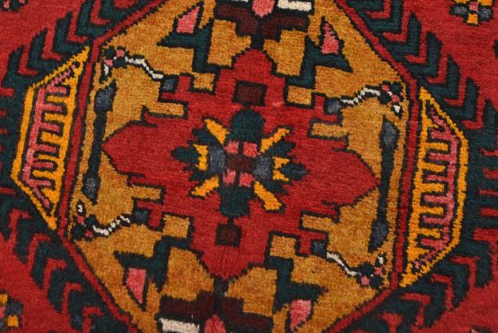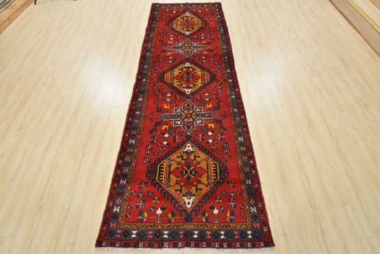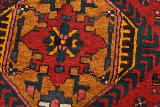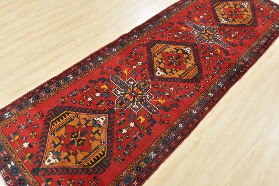 An authentic semi-antique tribal Karajeh runner hand-knotted with fine wool and natural dyes. This nomadic oriental rug features geometric medallions surrounded by geometric motifs set against a red background. It has a full wool pile with no worn areas and is in very good condition.